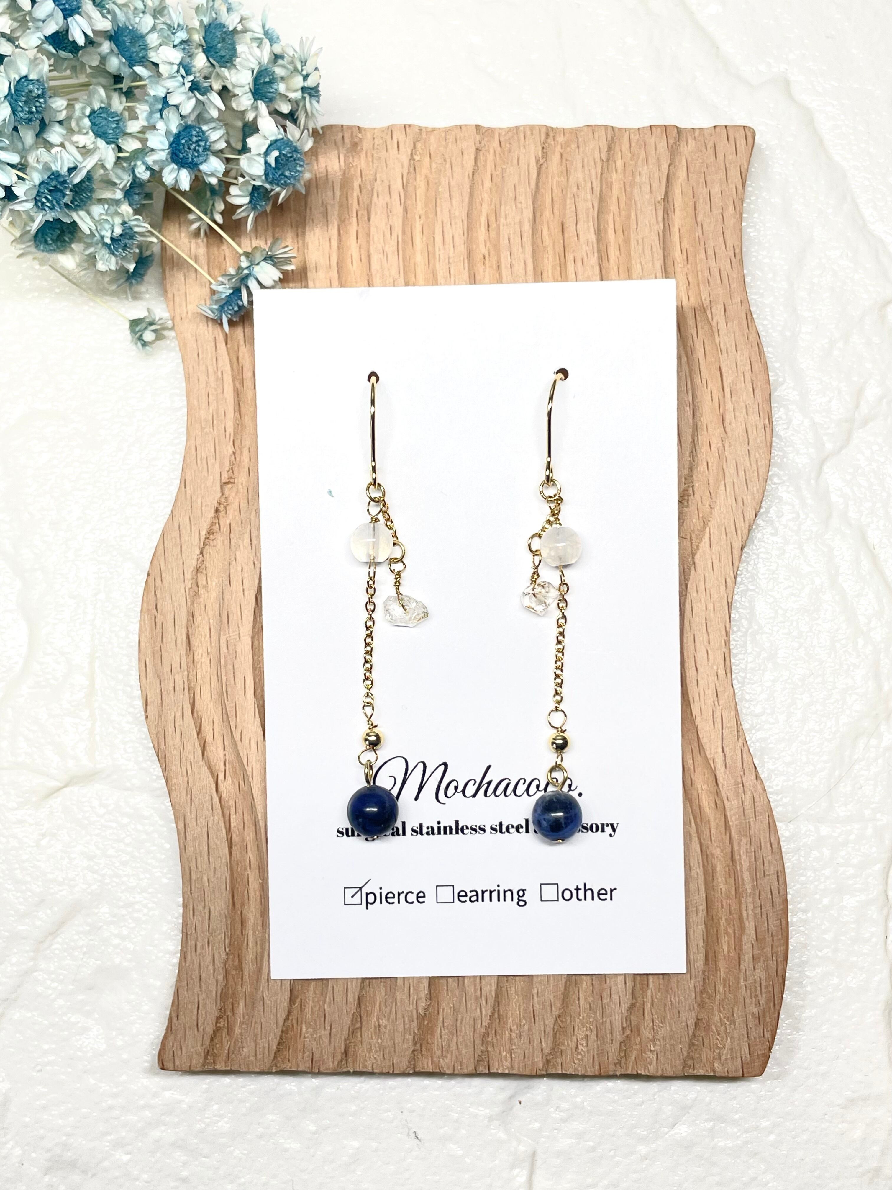 - アシンメトリー 天然石ピアス ソーダライト ムーンストーン ハーキマダイヤモンド サージカルステンレス ゆれるピアス -