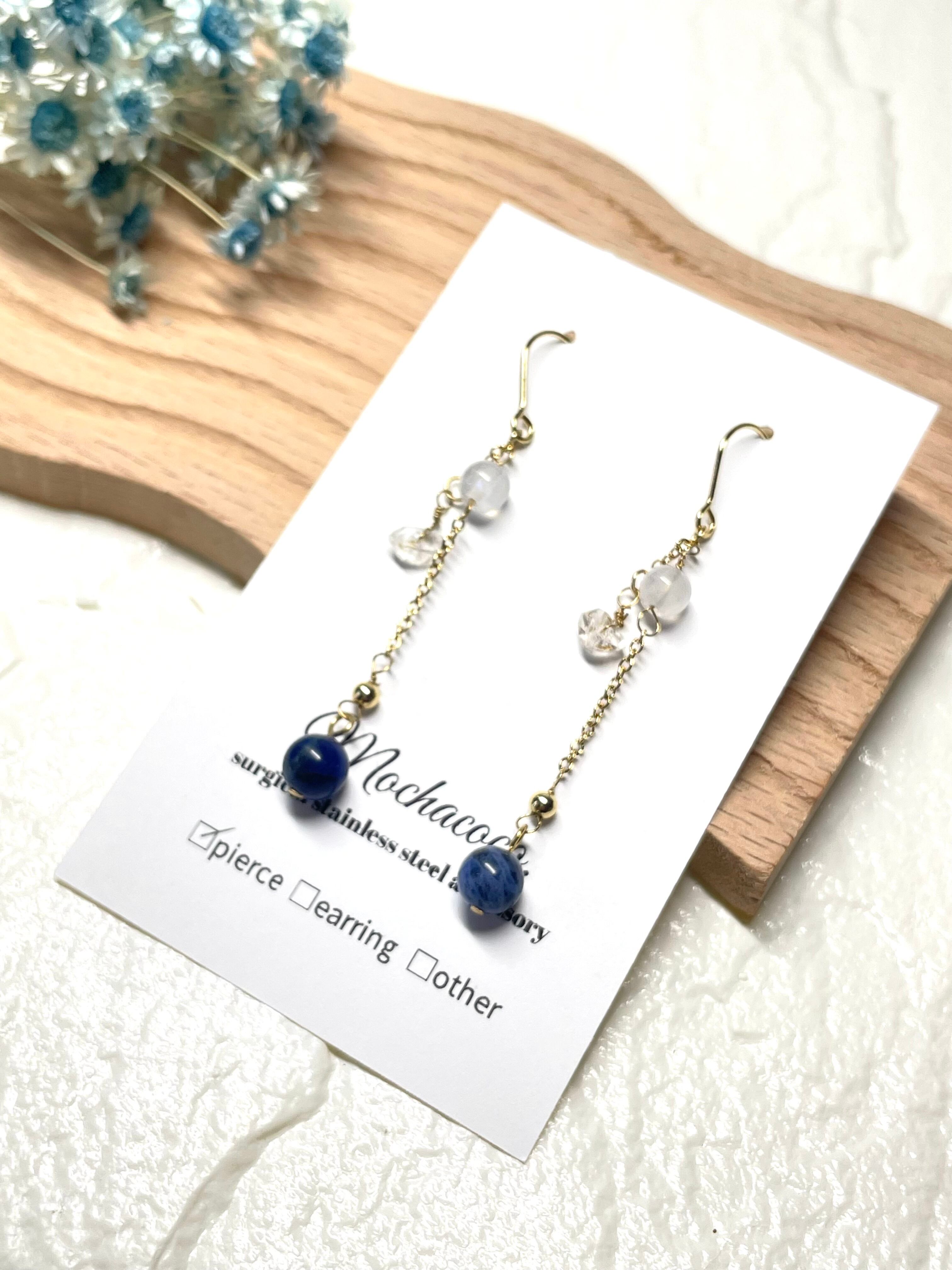 アシンメトリー 天然石ピアス ソーダライト ムーンストーン ハーキマダイヤモンド サージカルステンレス ゆれるピアス