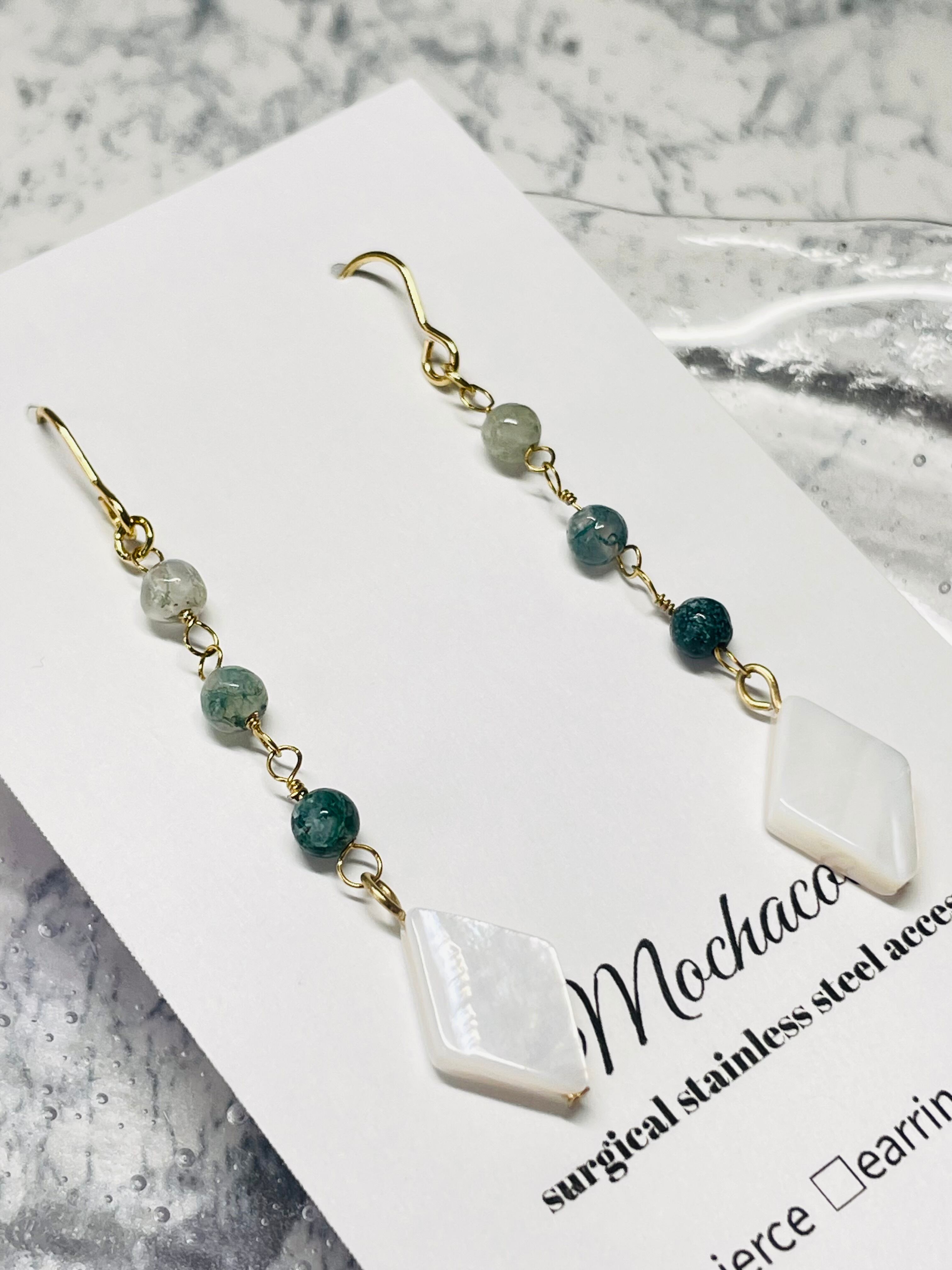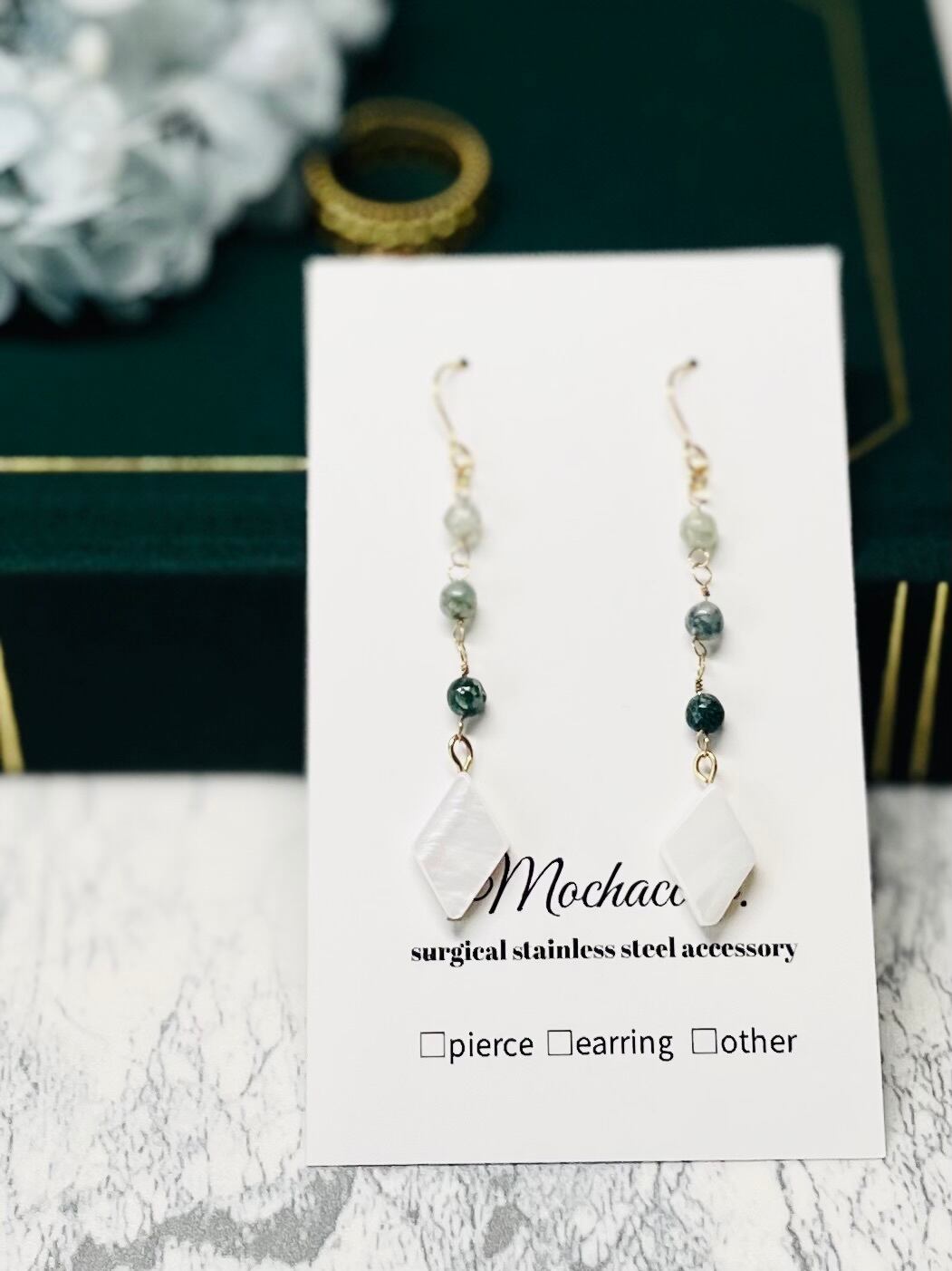 美しいダイヤ型ホワイトシェルと、深い緑のモスアゲートを使用した、洗練された天然石ピアス