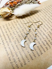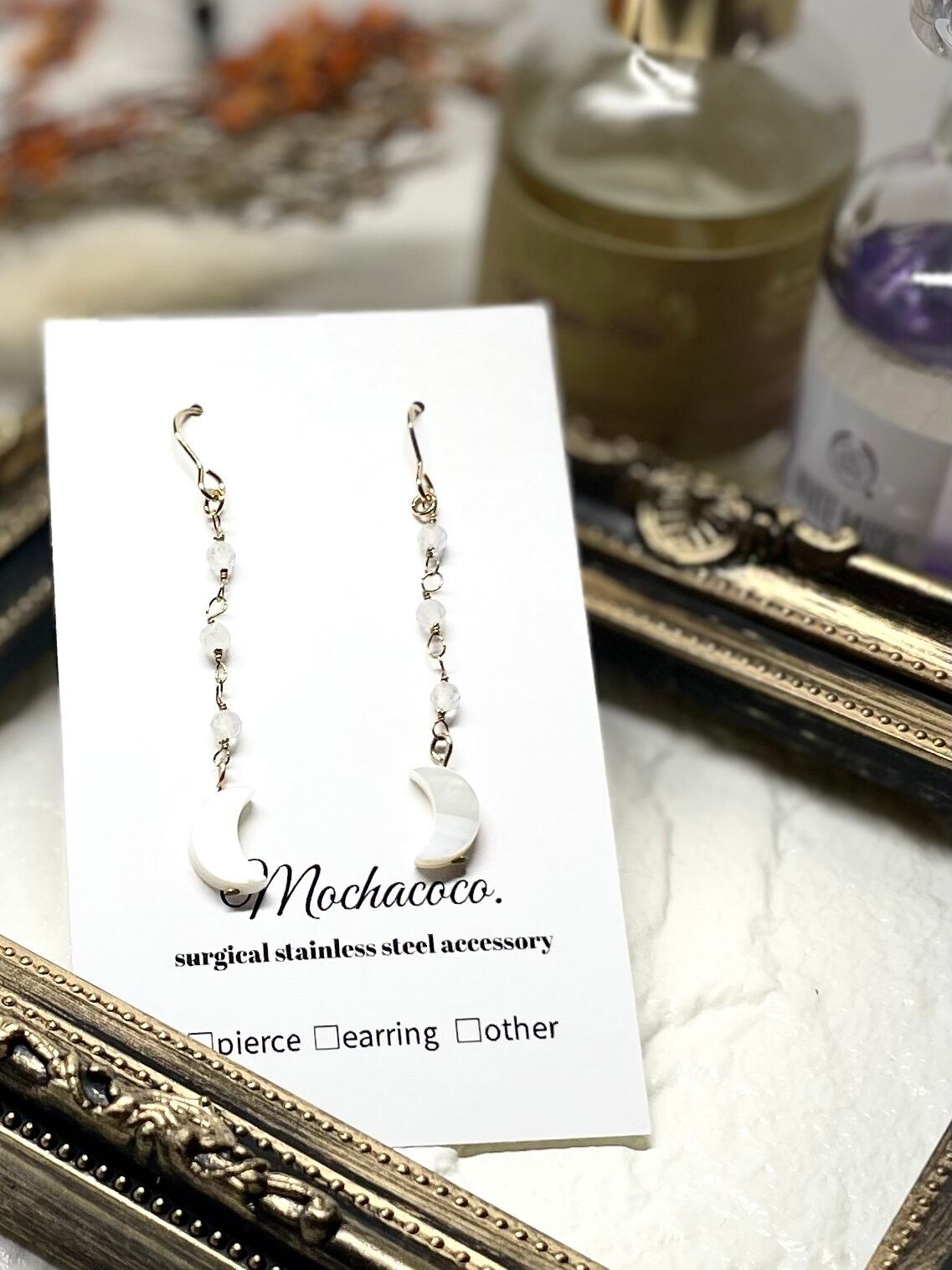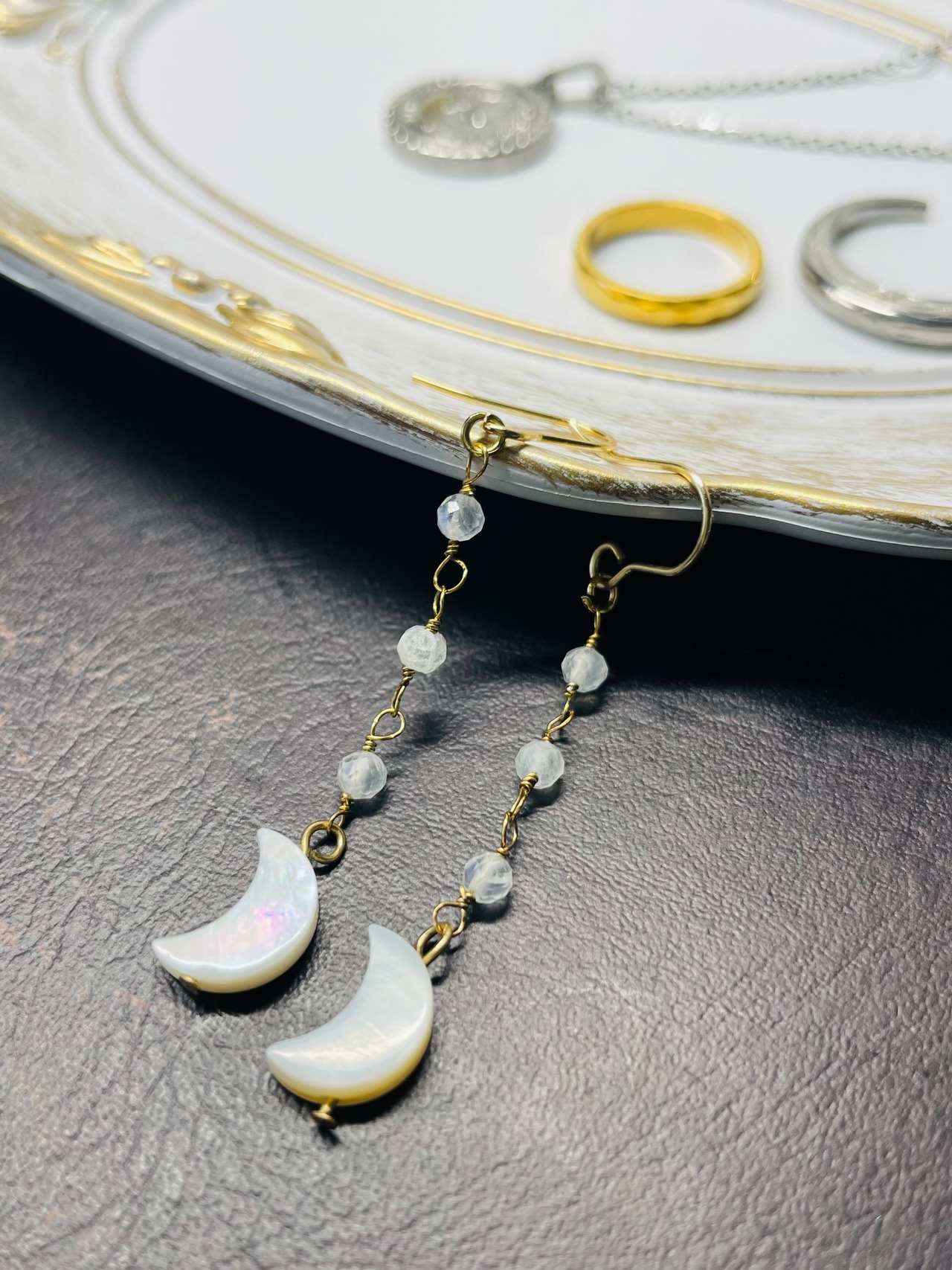 神秘的なブルームーンストーンと優美なムーン形のシェルを使用した、魅力的な天然石ピアス