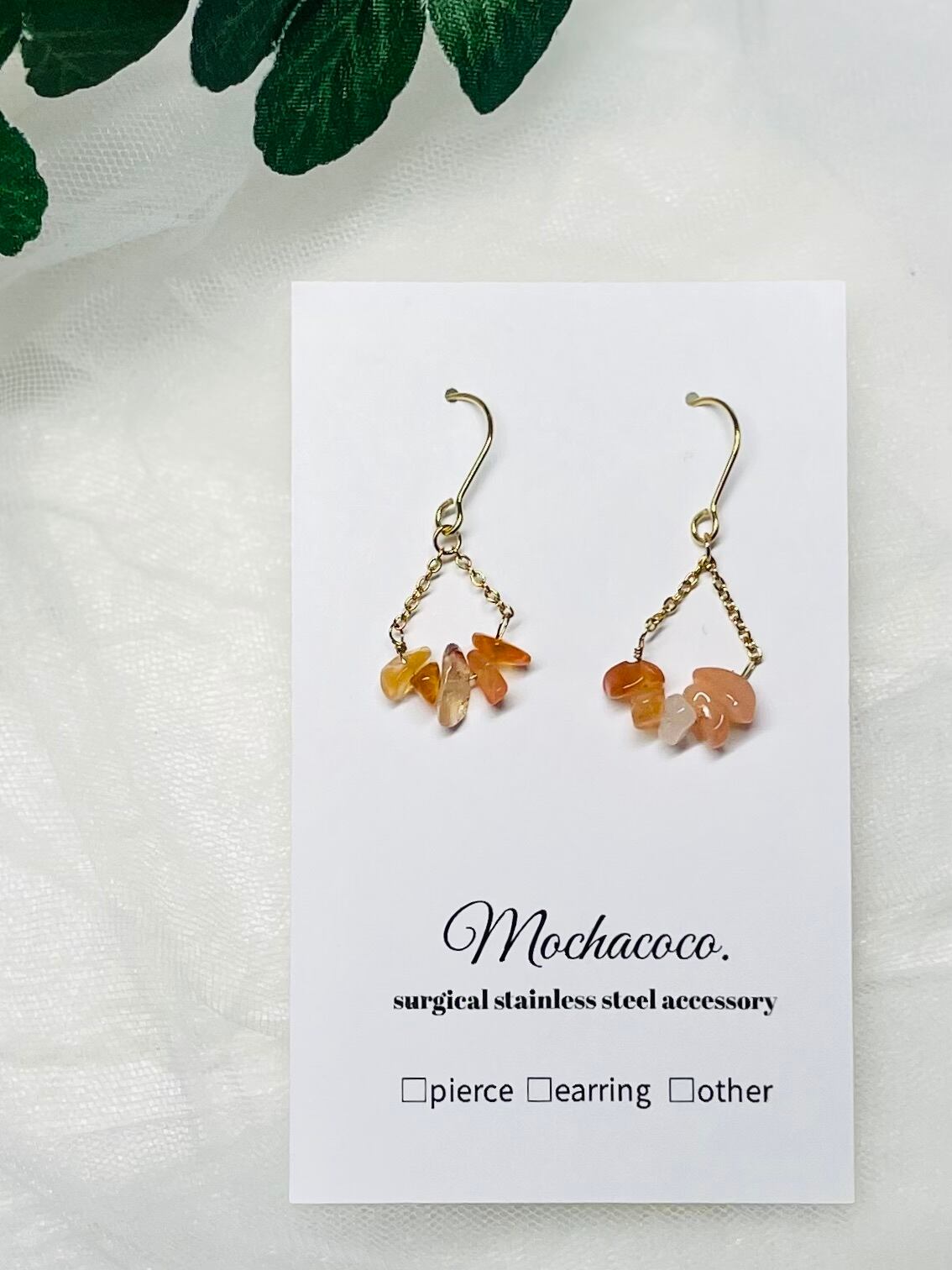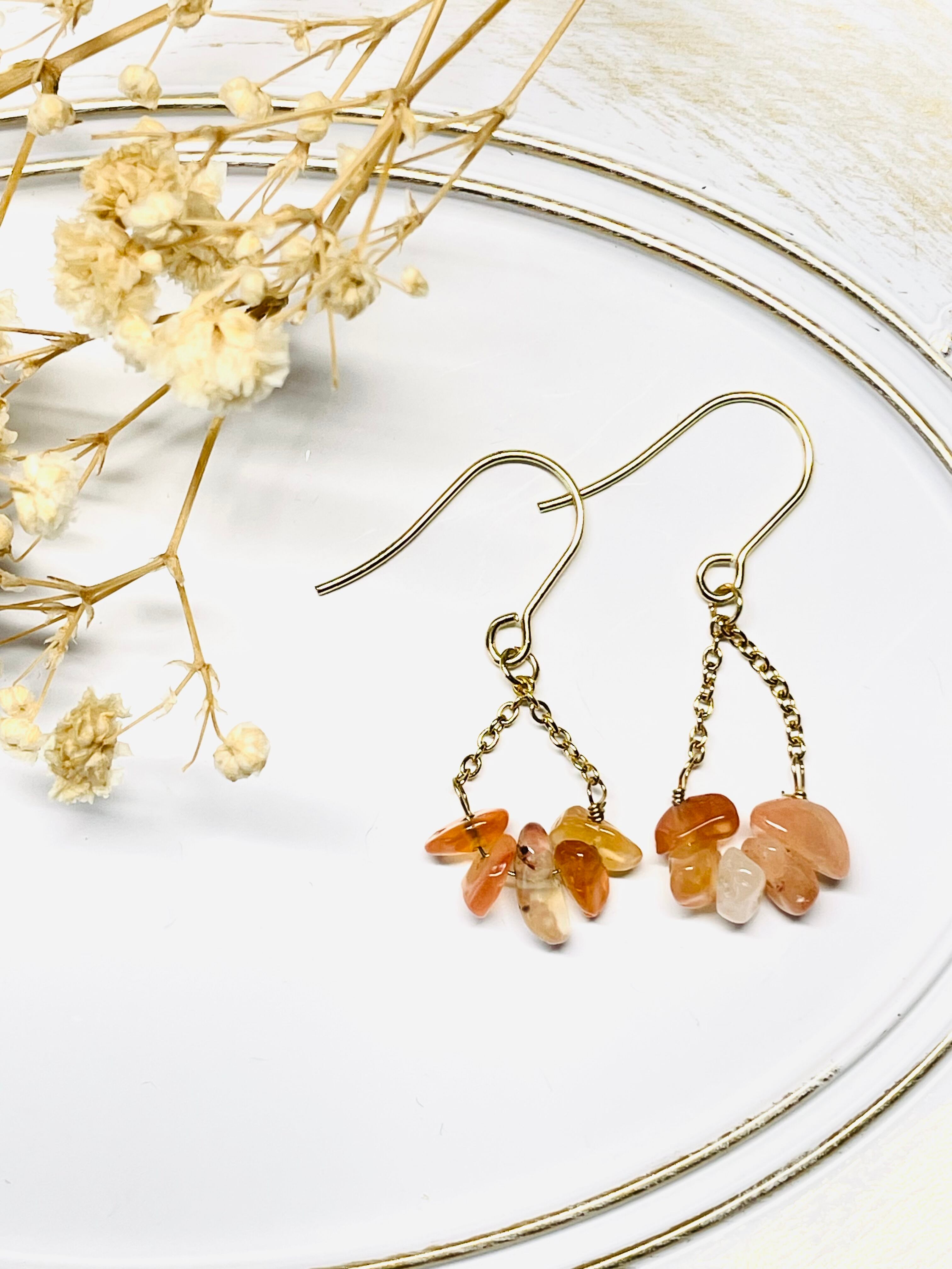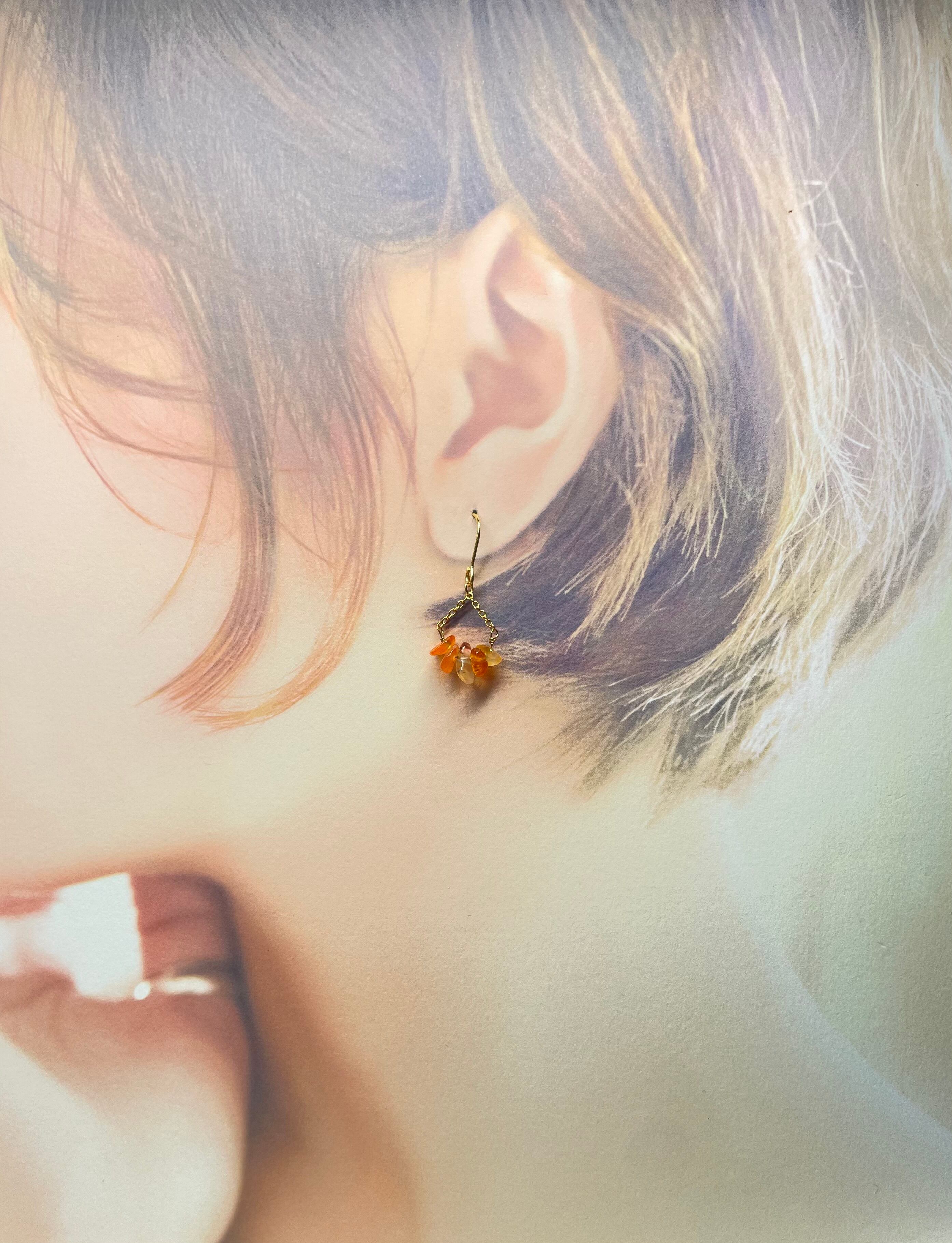 温かみのあるオレンジ色が魅力的なカーネリアンを使用した、扇形デザインの天然石ピアス