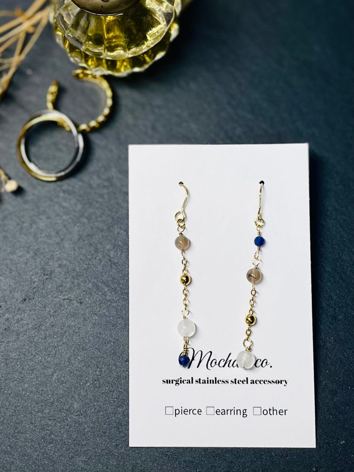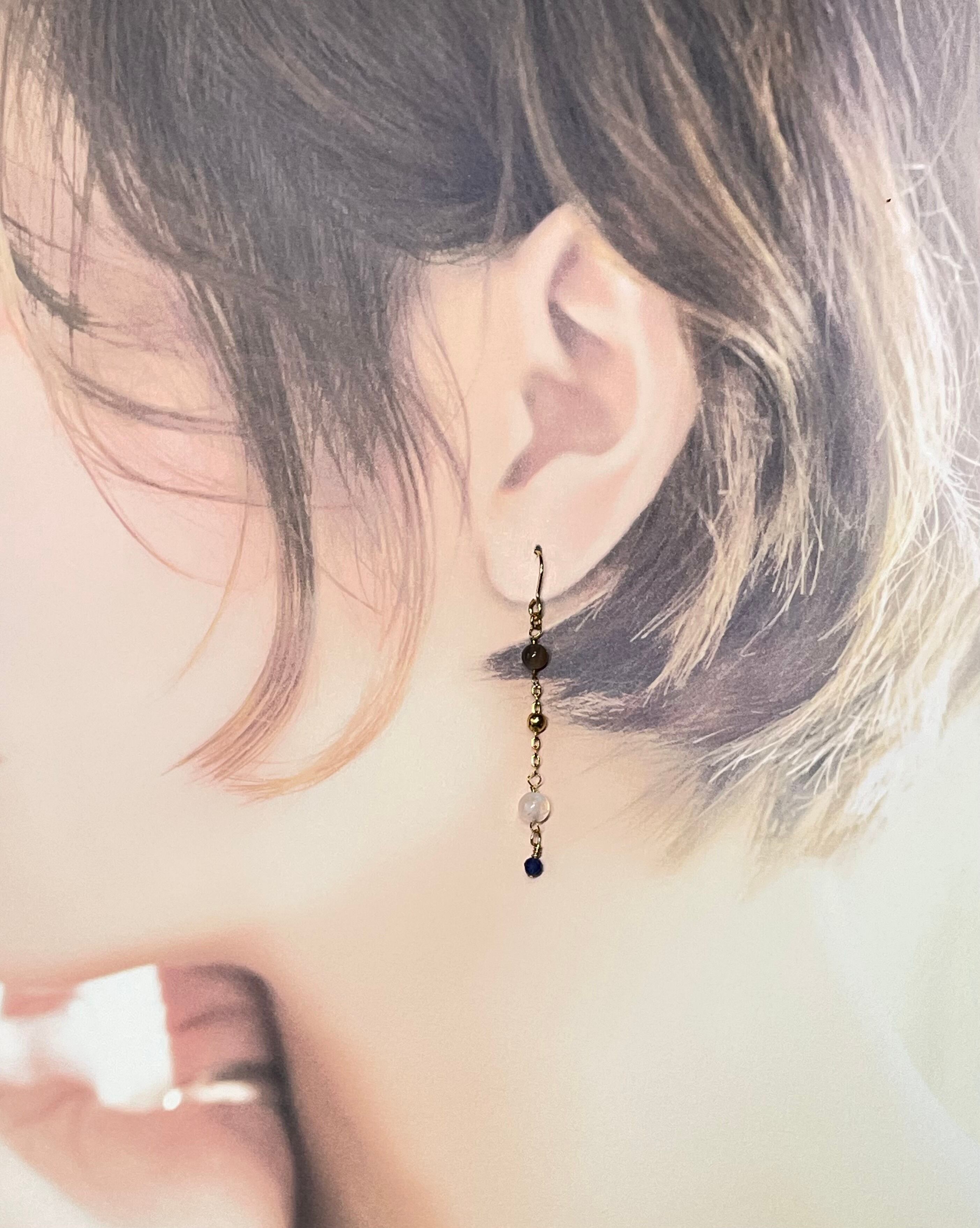 天然石ピアス アシンメトリー ソーダライト マルチカラームーンストーン サージカルステンレス ゆれるピアス