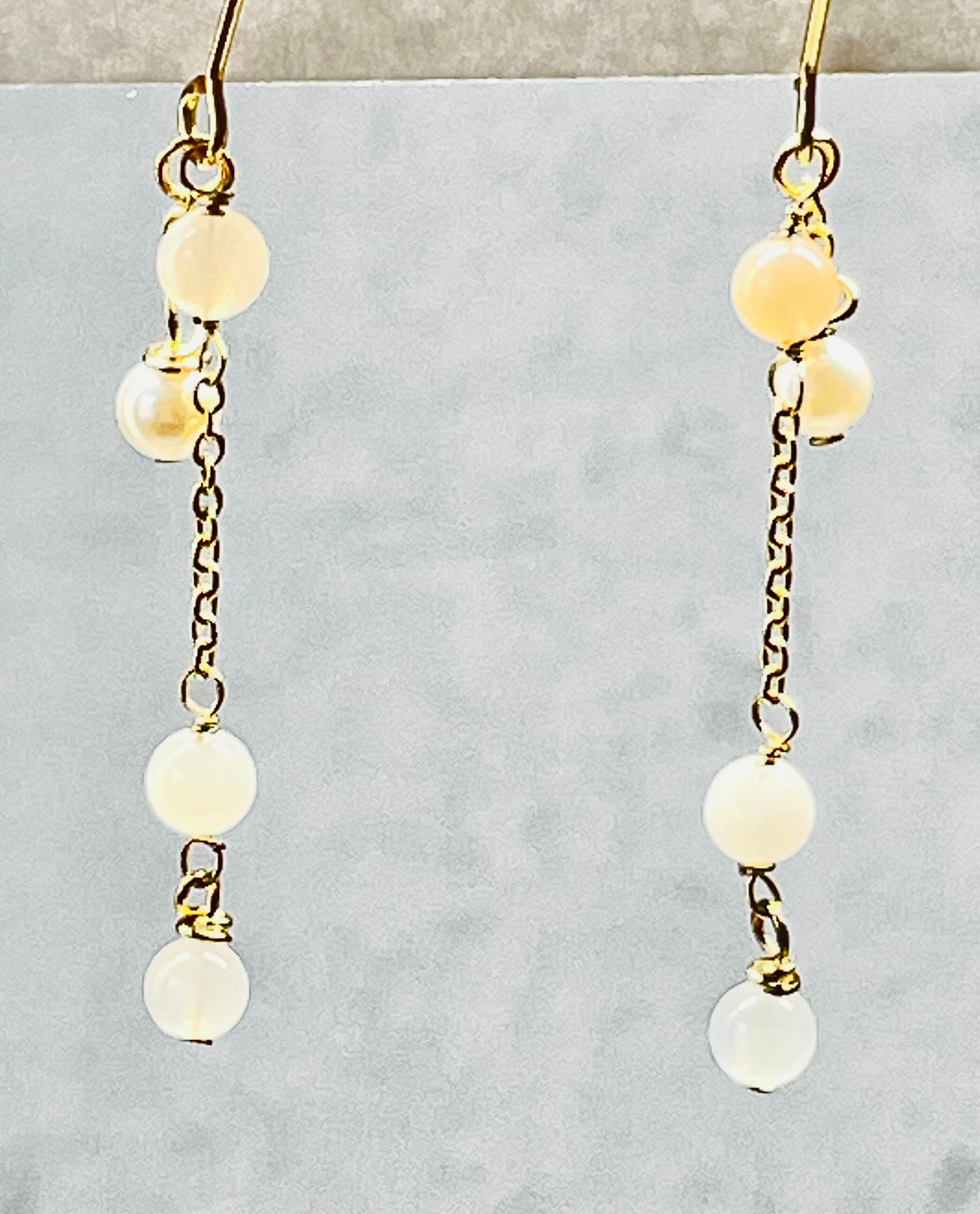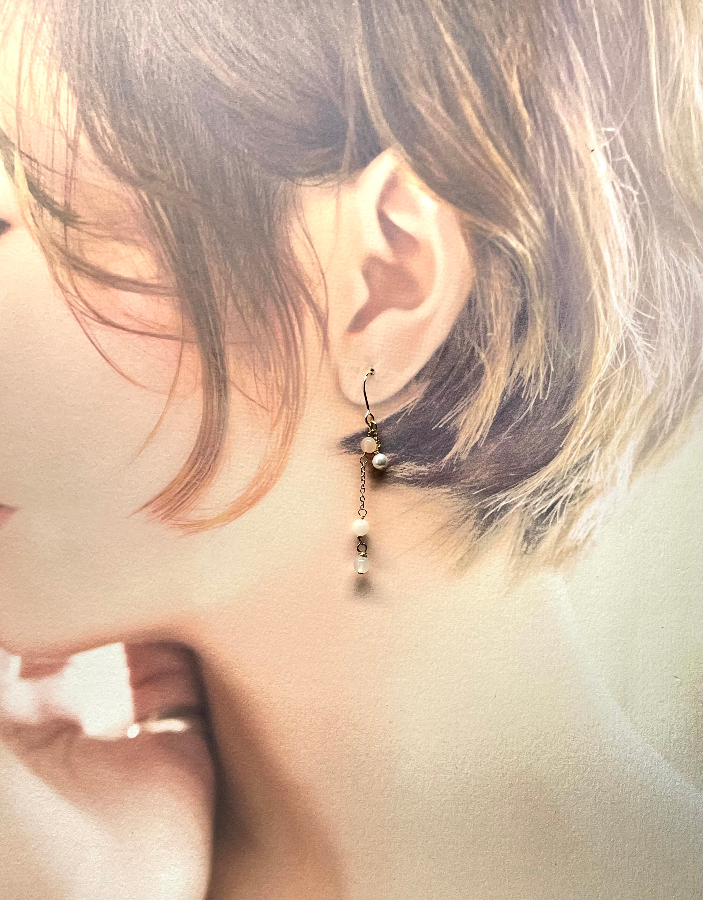 マルチカラームーンストーンと上品なパールを使用した、優雅にゆれるデザインの天然石ピアス