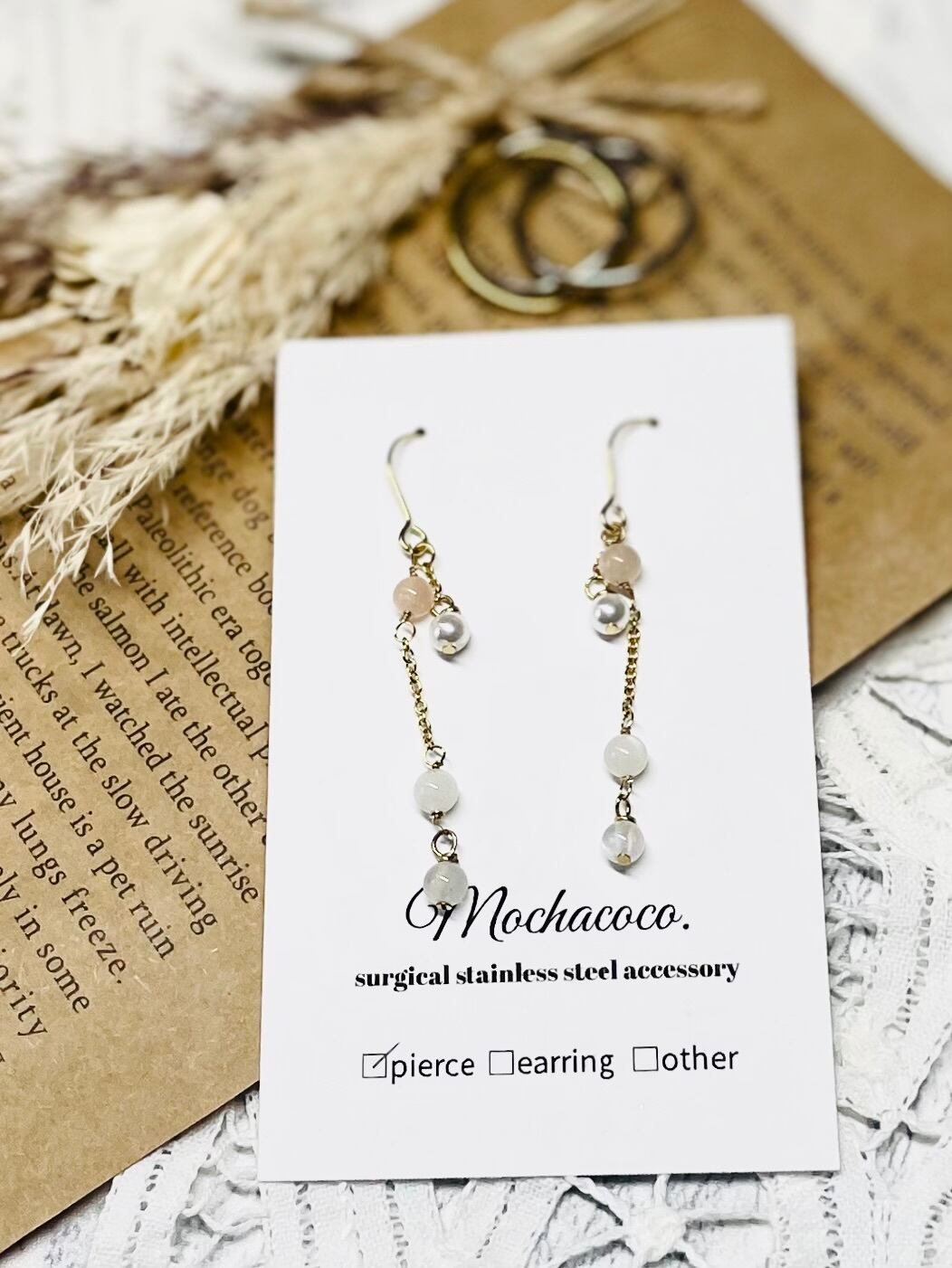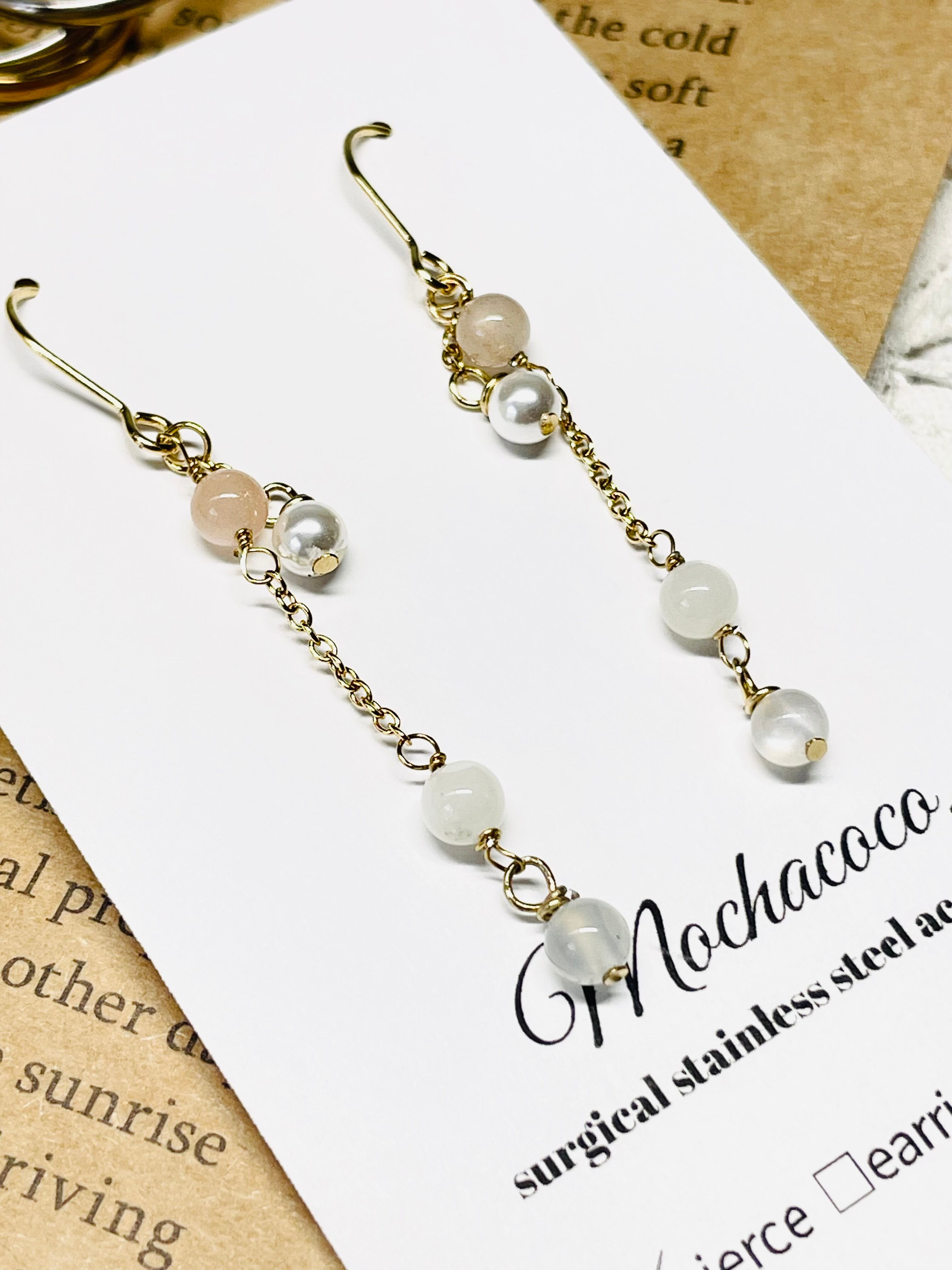 - 天然石ピアス マルチカラームーンストーン パール サージカルステンレス ゆれるピアス -