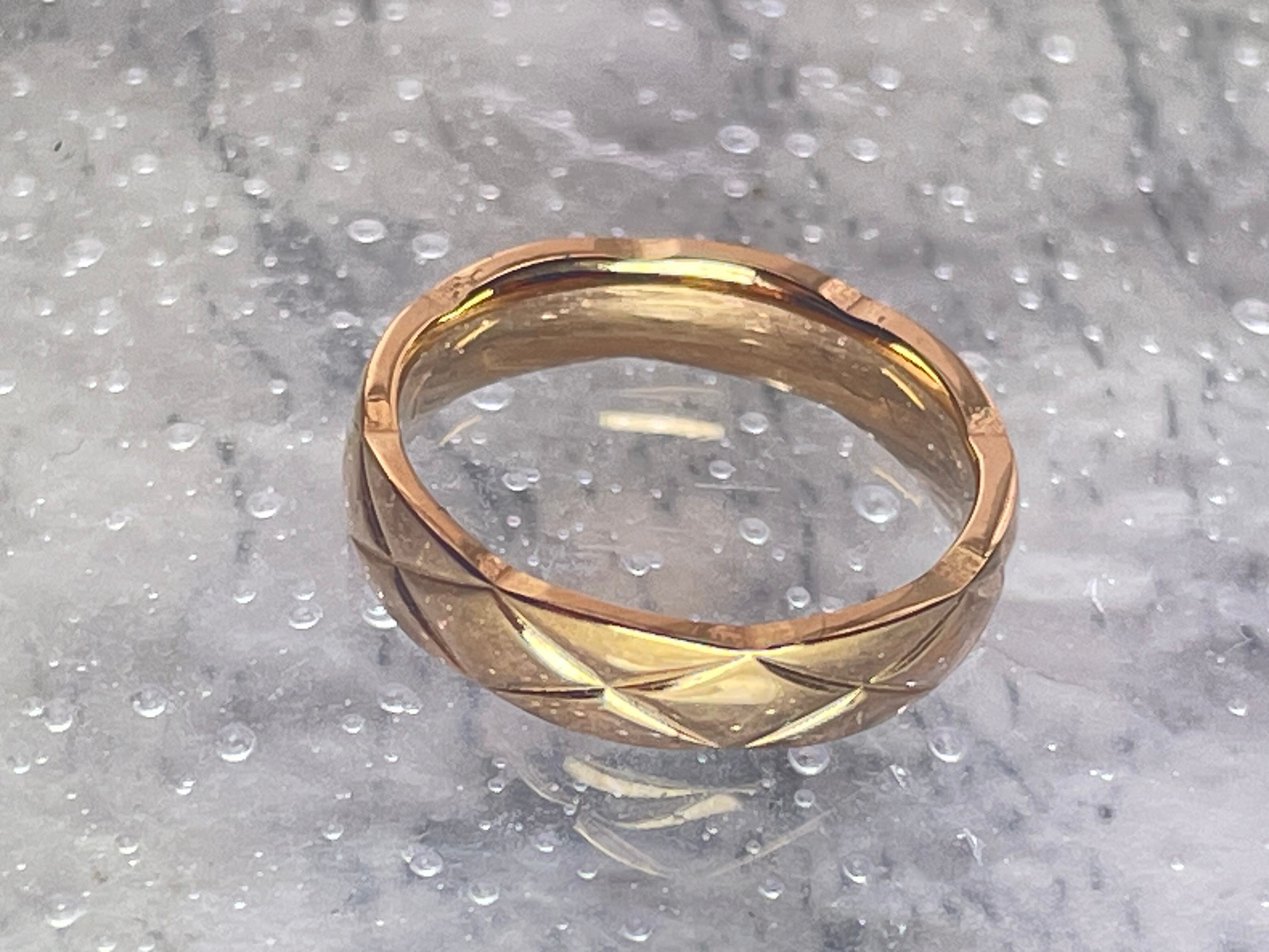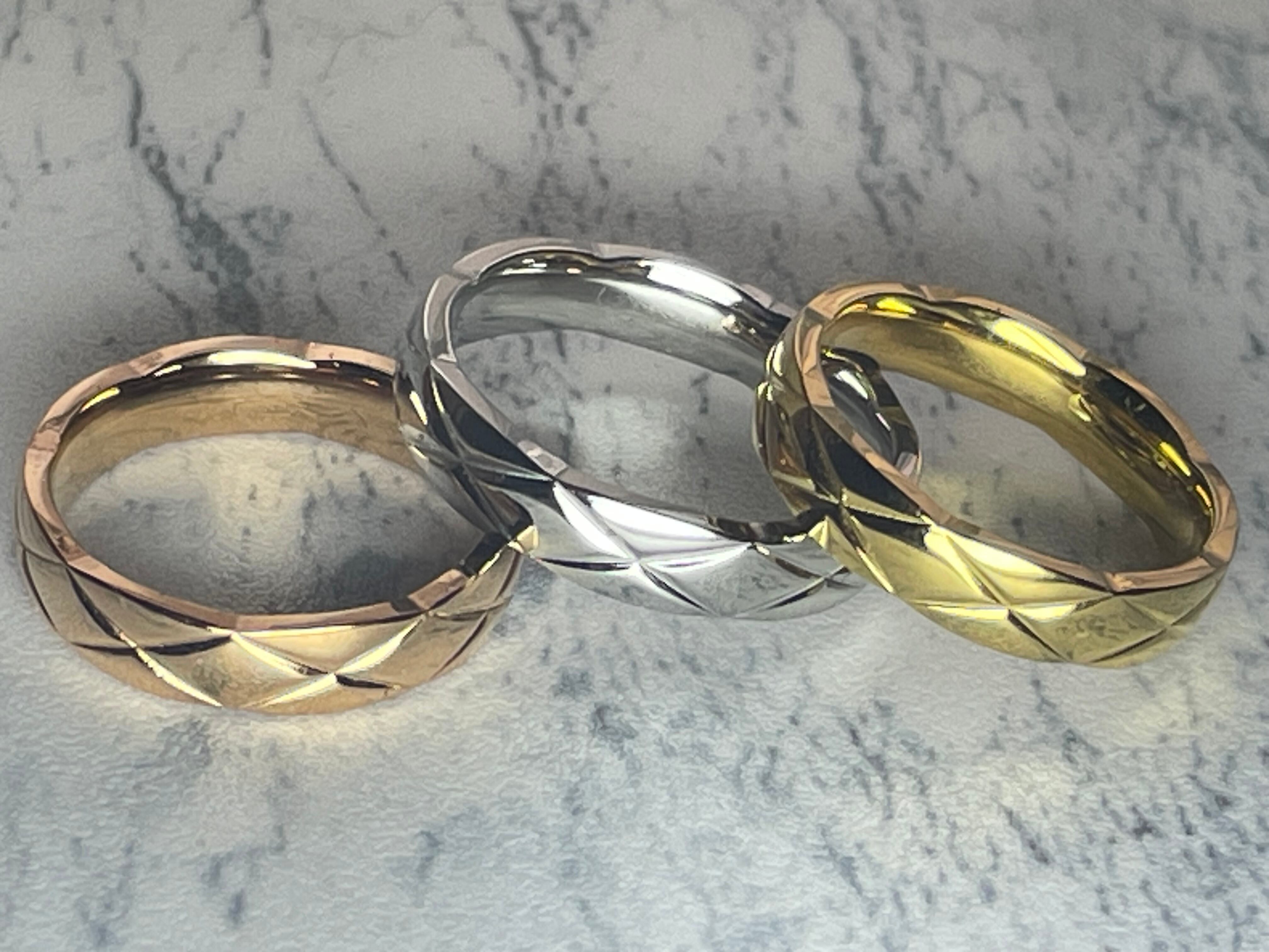 太幅のキルティングデザインが印象的な、サージカルステンレスリング。シルバー、ゴールド、ピンクゴールドの3色展開で、カジュアルからエレガントなスタイリングまで幅広く楽しめます。