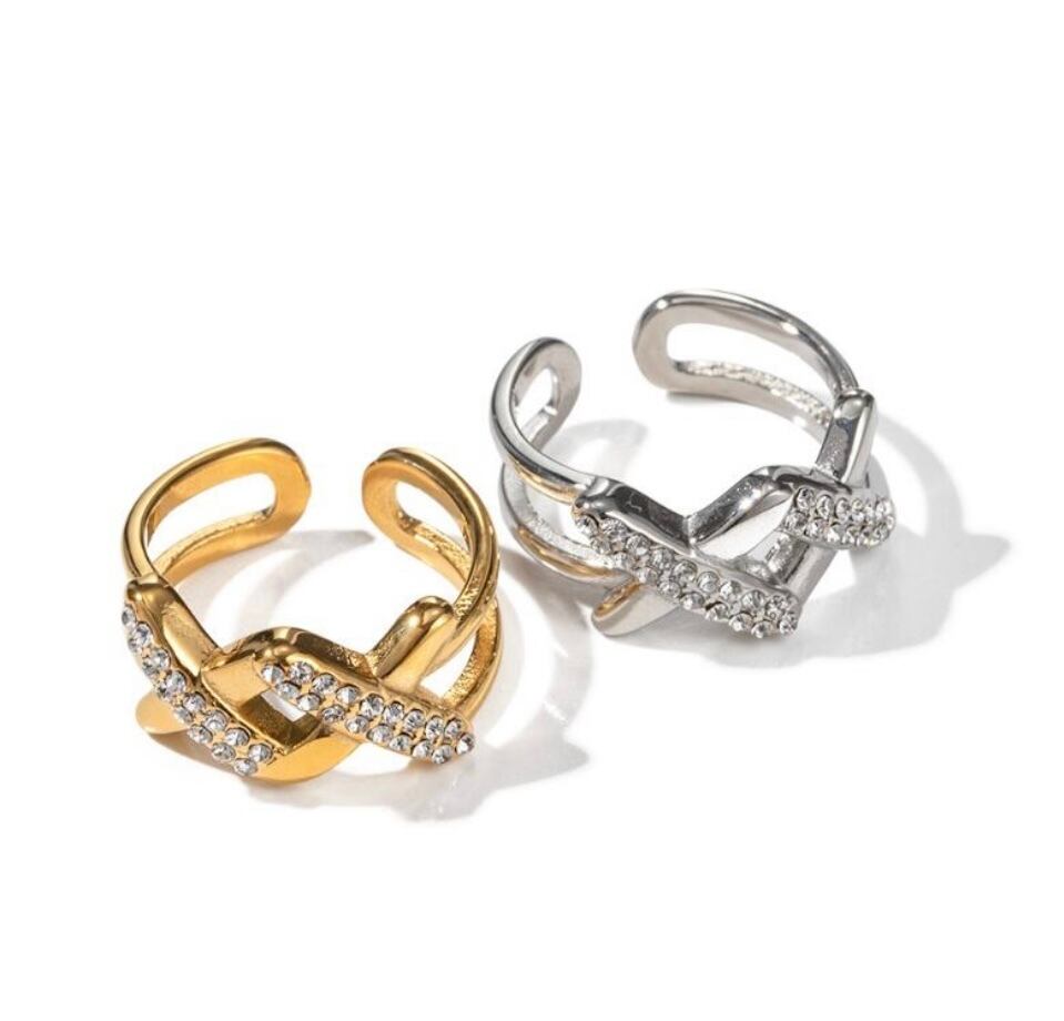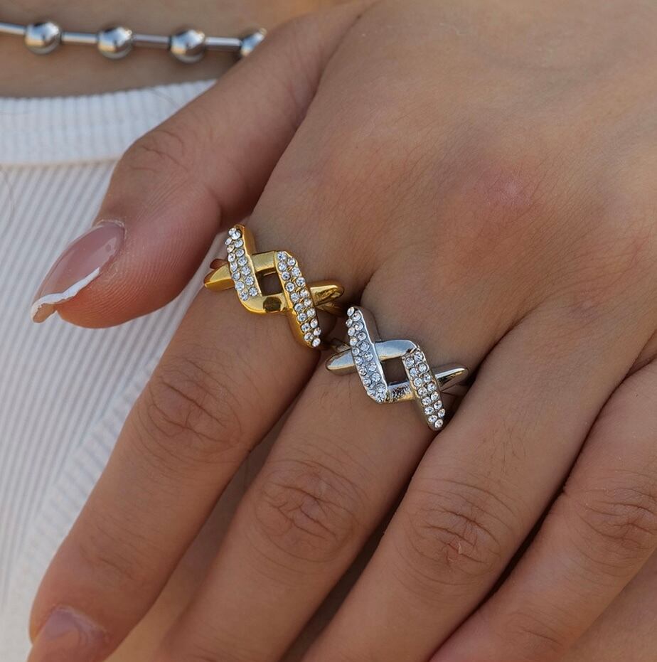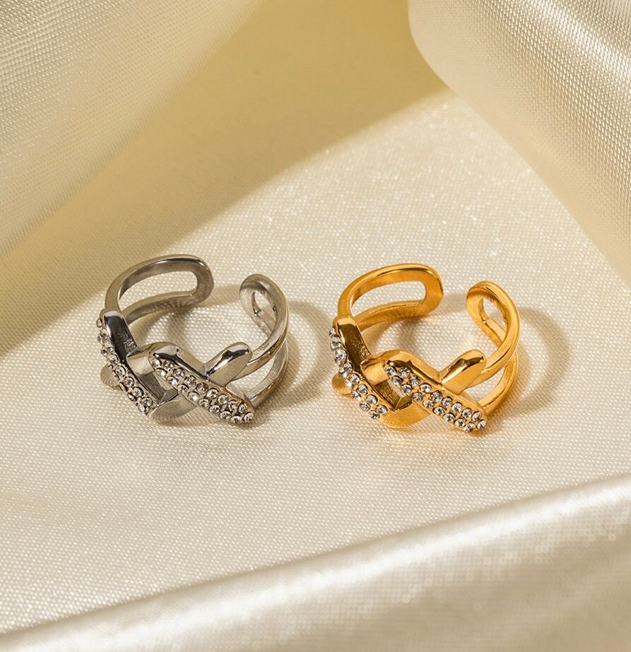 シンプルでありながら個性的なキュービックジルコニア ダブルクロス リングです。ダブルクロスのデザインは、シンメトリーながらも独特なアクセントを生み出し、指先を華やかにしてくれます。キュービックジルコニアの輝きは、まるで本物のダイヤモンドのようで、高級感を演出してくれます。また、サージカルステンレス素材が使用されているため、アレルギーの心配もありません。