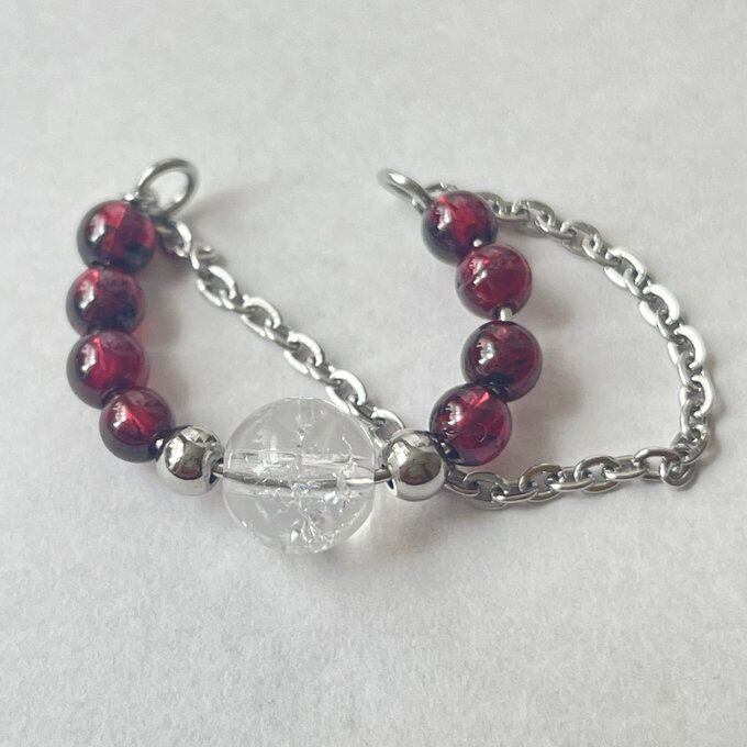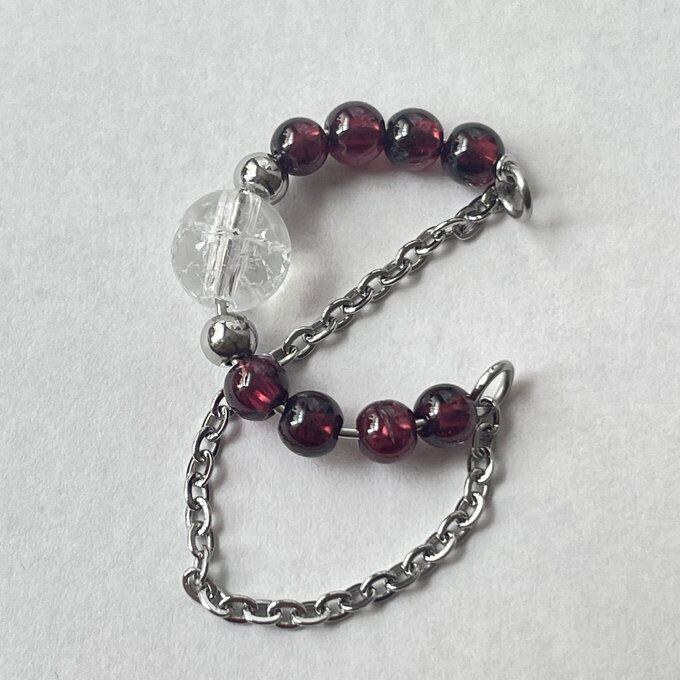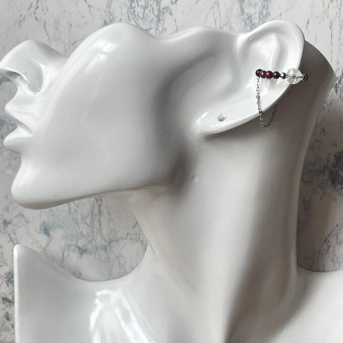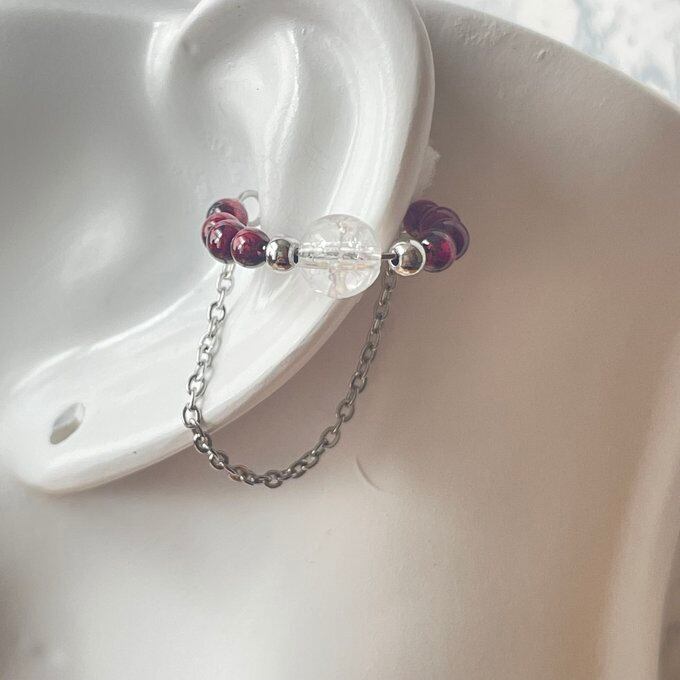 天然石 イヤーカフ チェーンイヤーカフ 1連 ガーネット×水晶 シルバー色 サージカルステンレス製 【受注生産】
