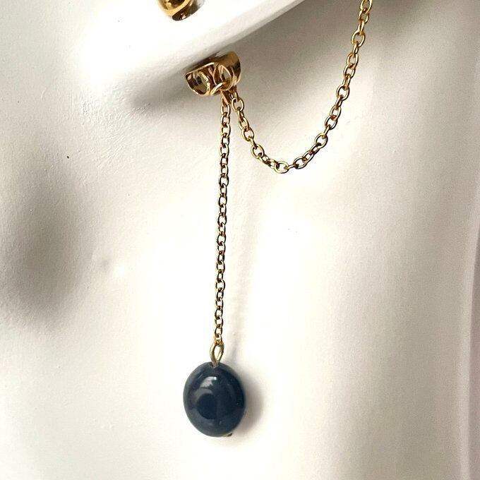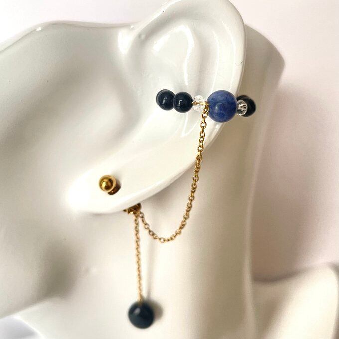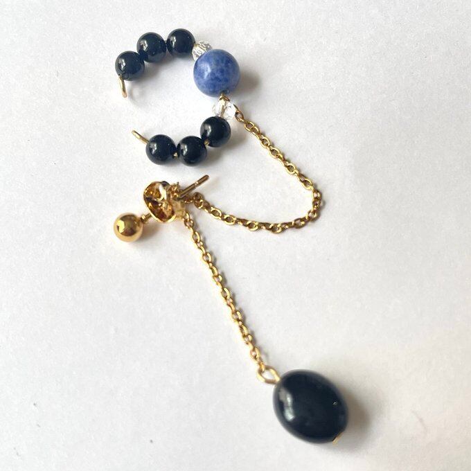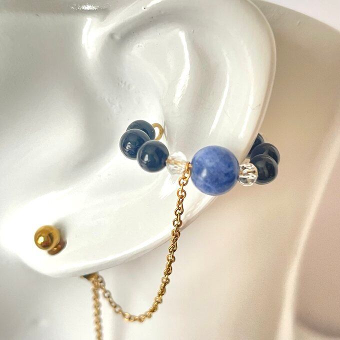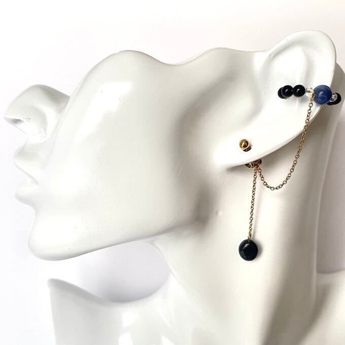 天然石 イヤーカフ イヤーカフ+ピアス ソーダライト×水晶×オニキス ゴールド色 サージカルステンレス製 【受注販売】