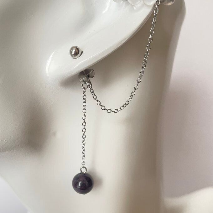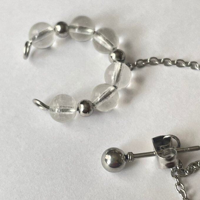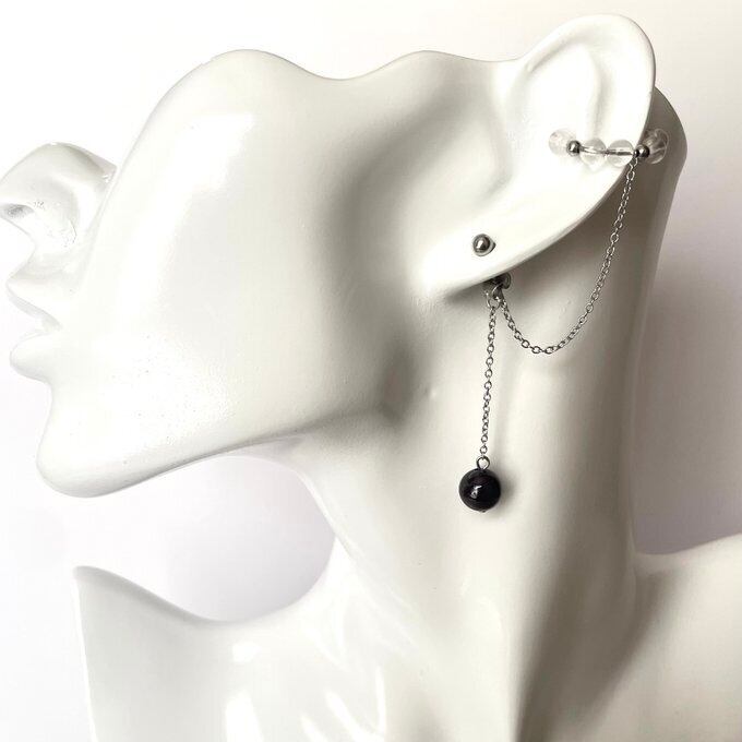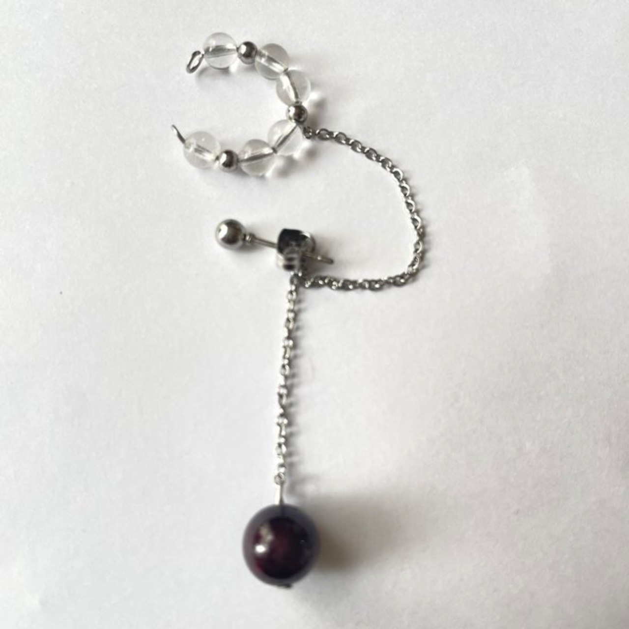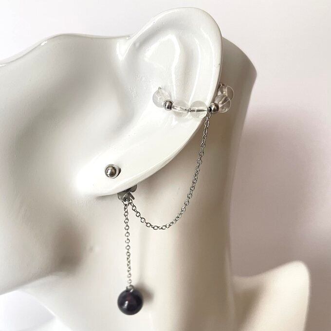 天然石 イヤーカフ イヤーカフ+ピアス ガーネット×水晶 シルバー色 サージカルステンレス製 【受注販売】