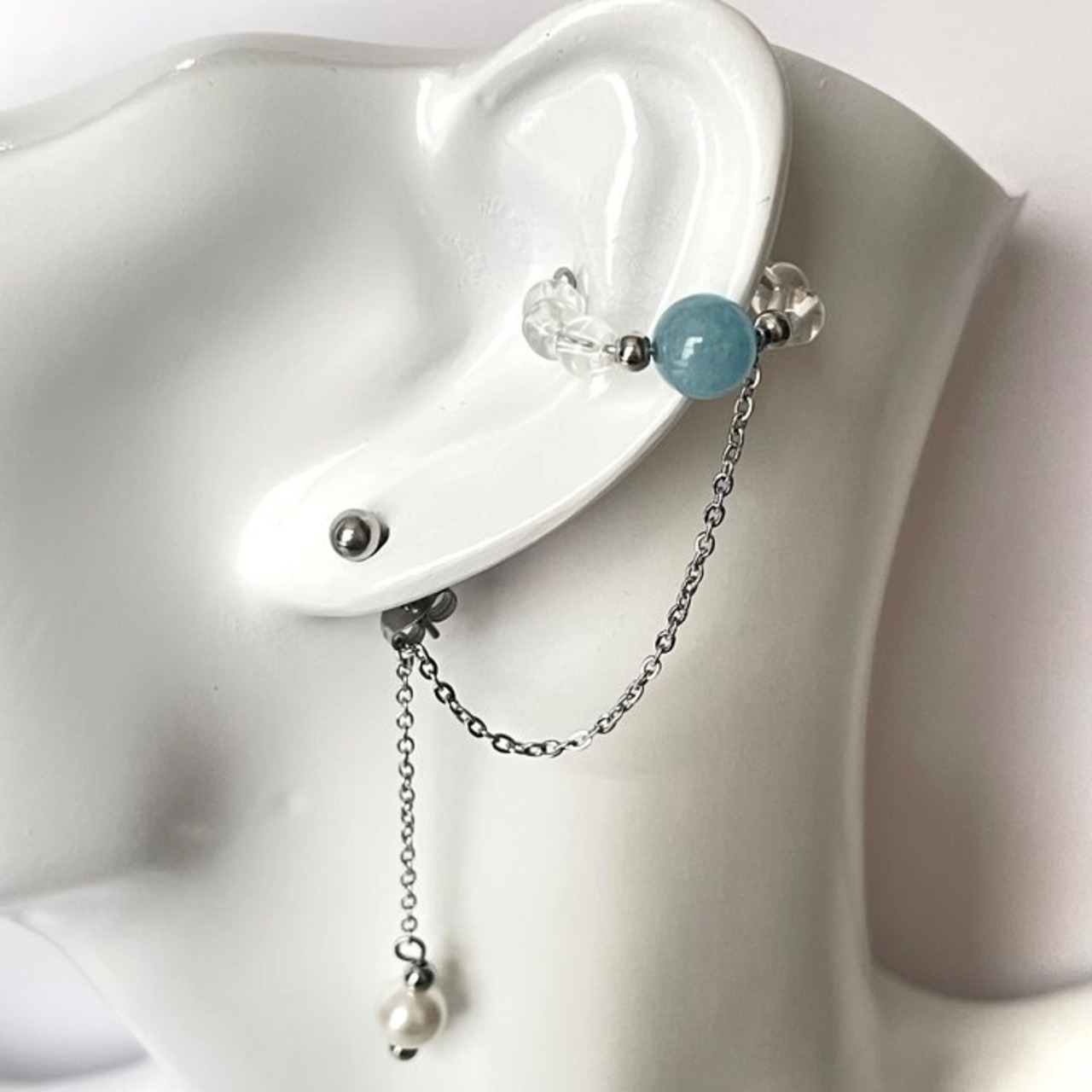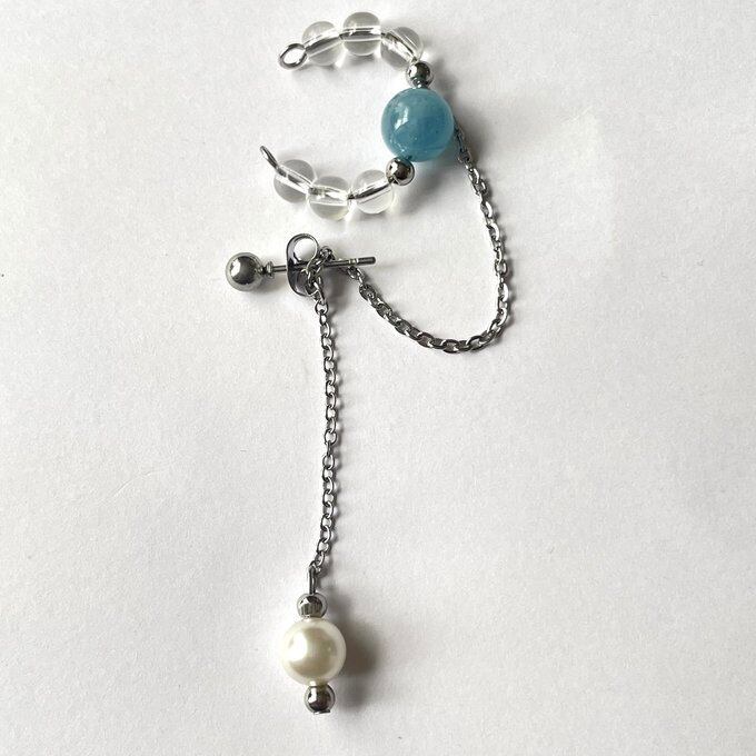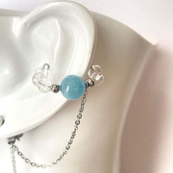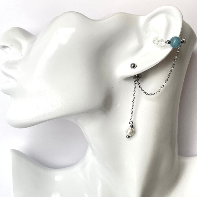 天然石 イヤーカフ イヤーカフ+ピアス 水晶×貝パール×アクアマリン シルバー色 サージカルステンレス製 【受注販売】