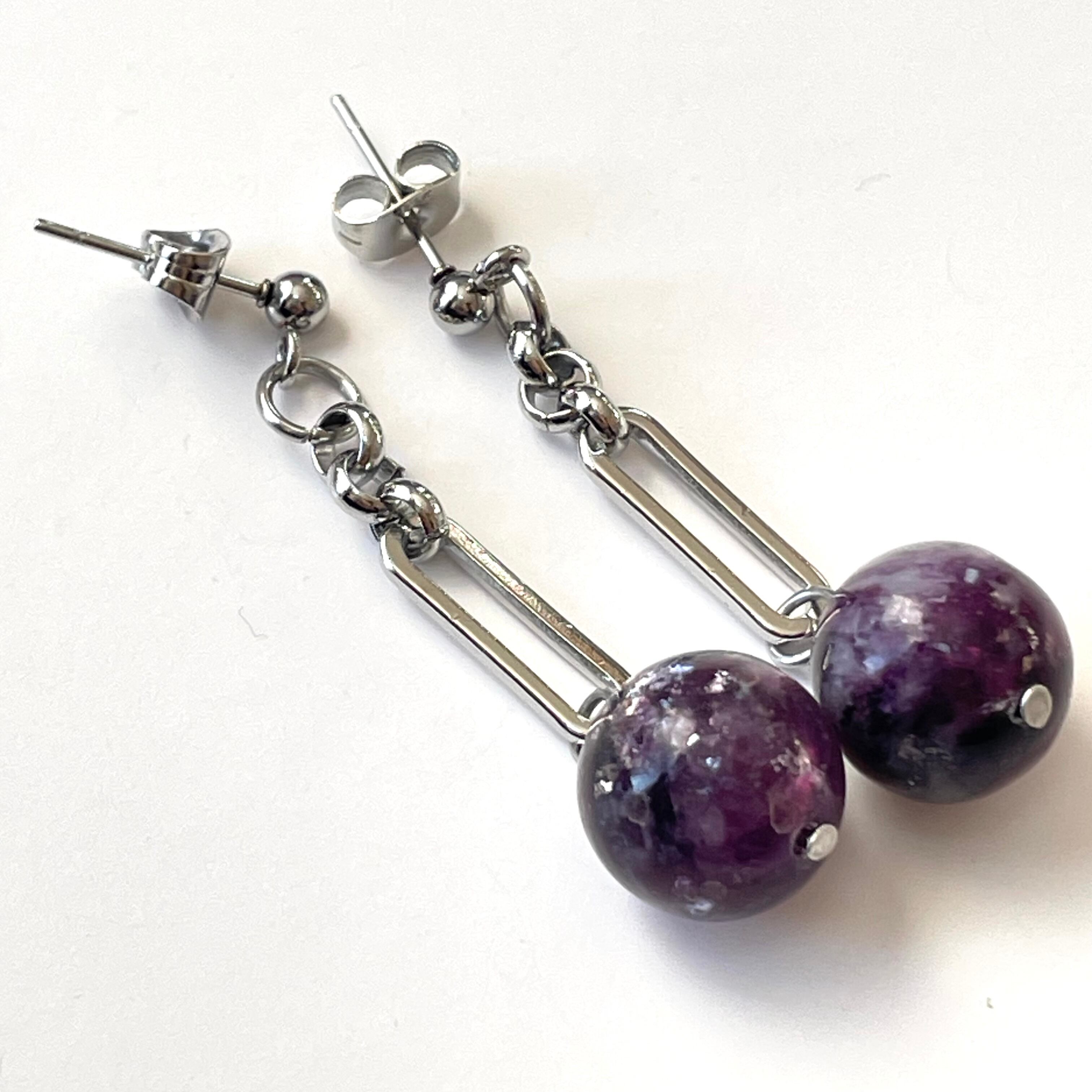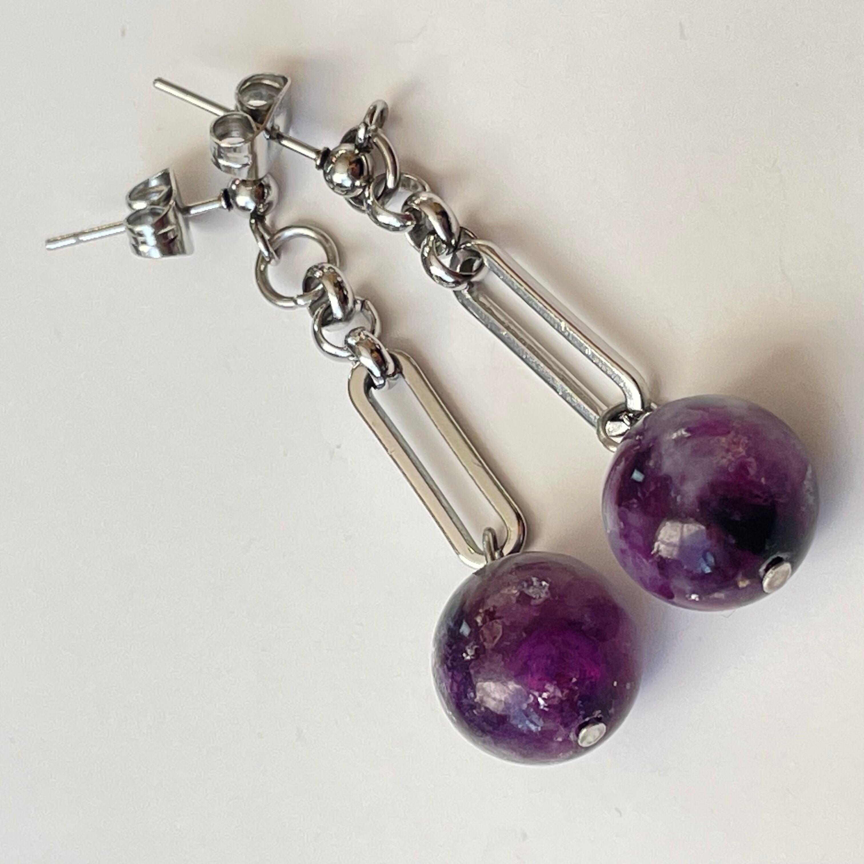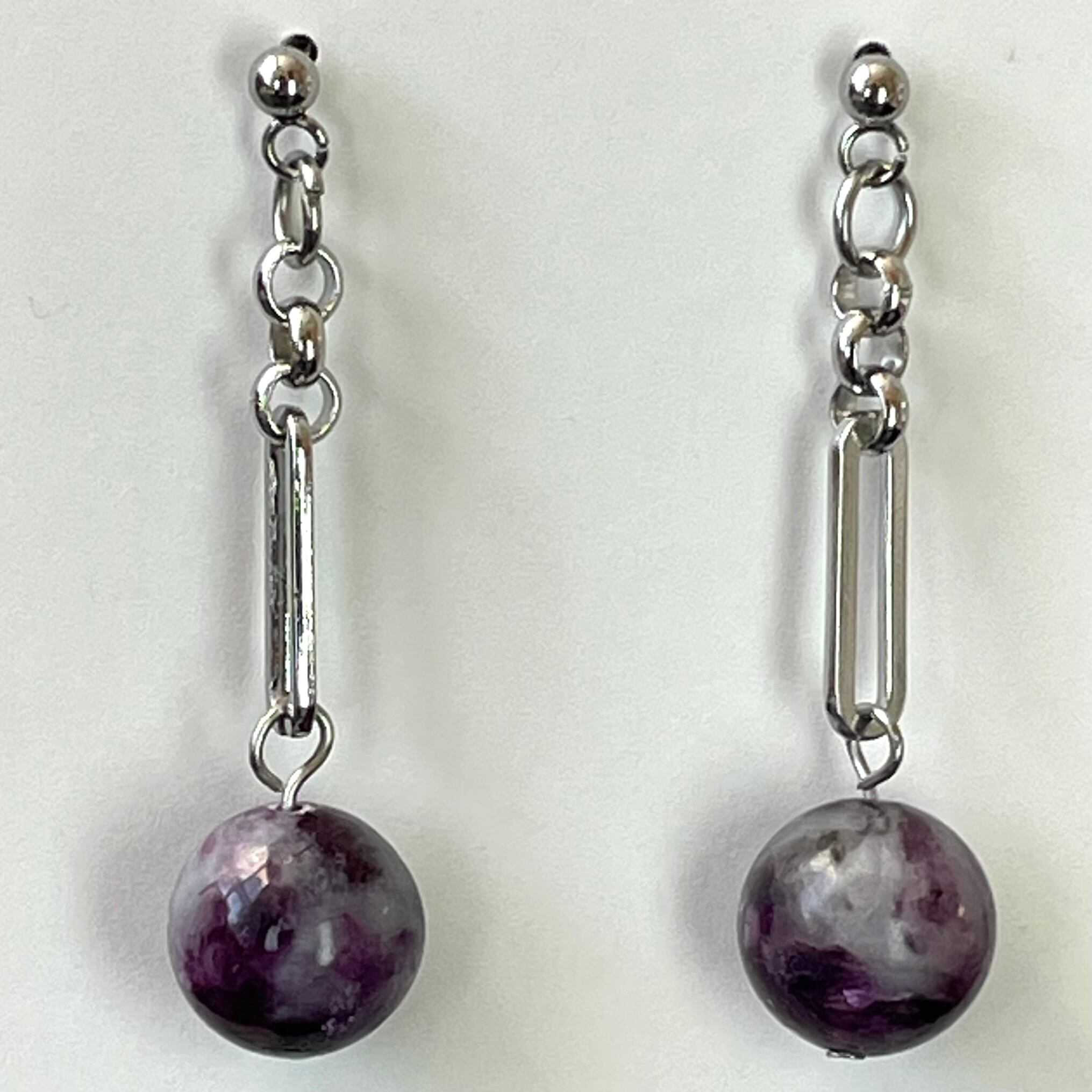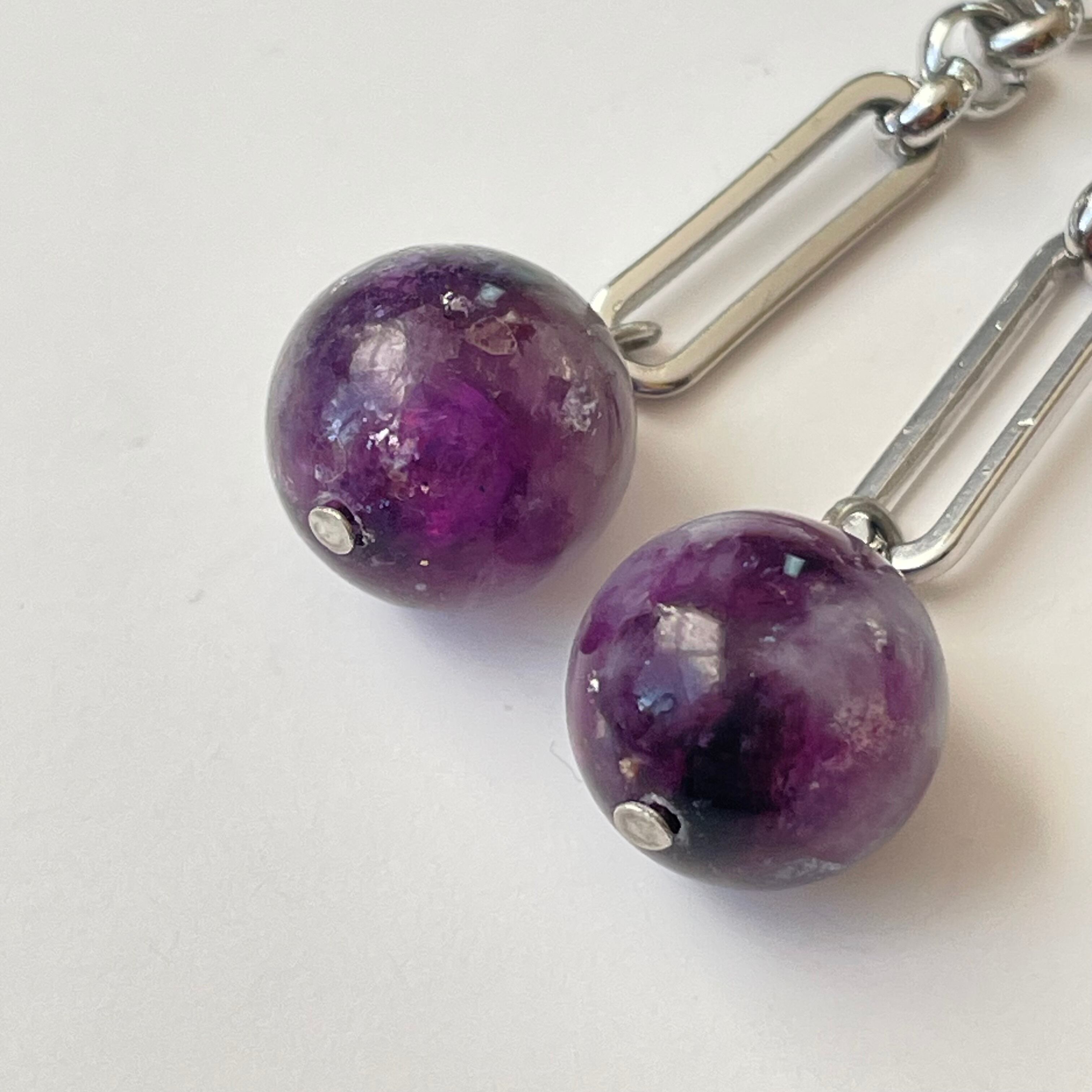 天然石の魅力的な紫色が印象的なデザインで、動くたびに耳元で優雅な存在感を放ちます。おしゃれを楽しむすべての方におすすめです。
