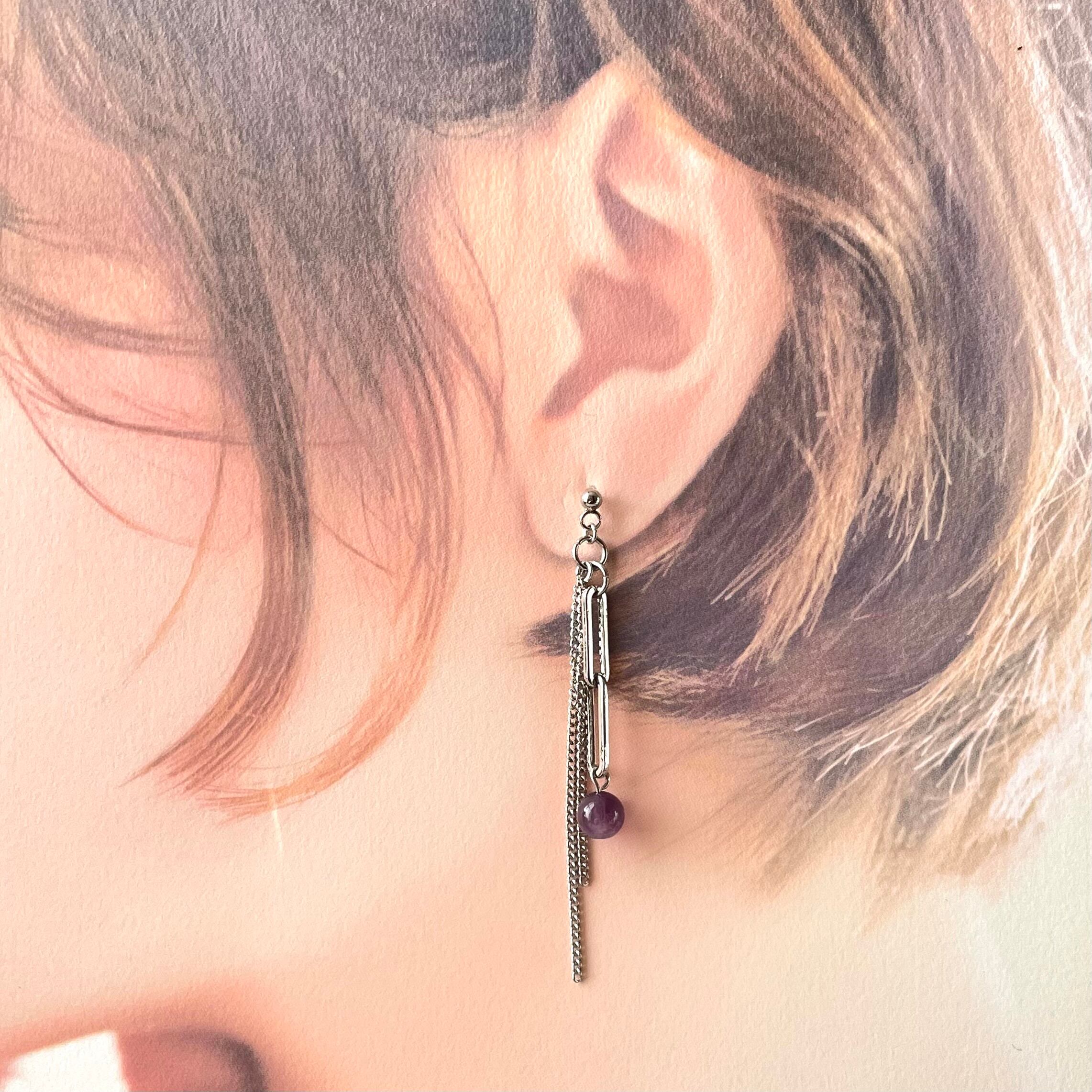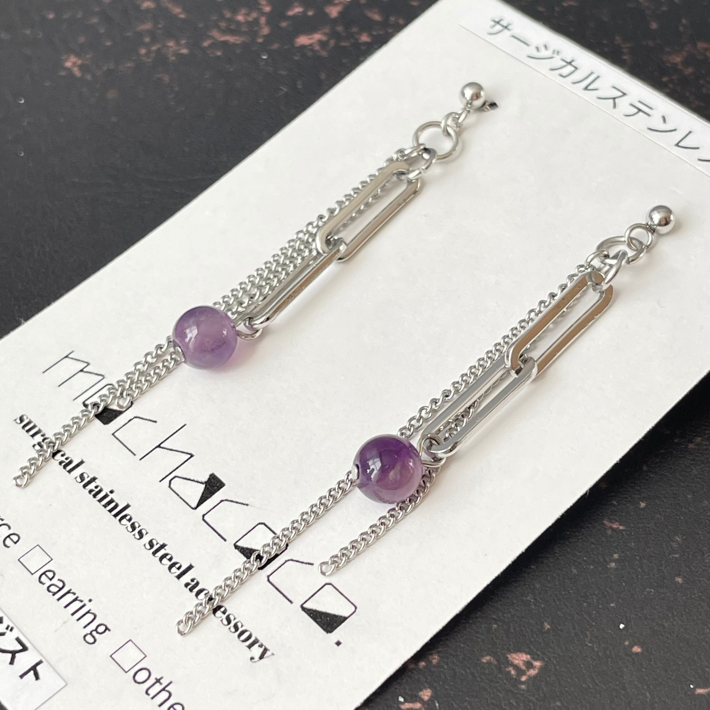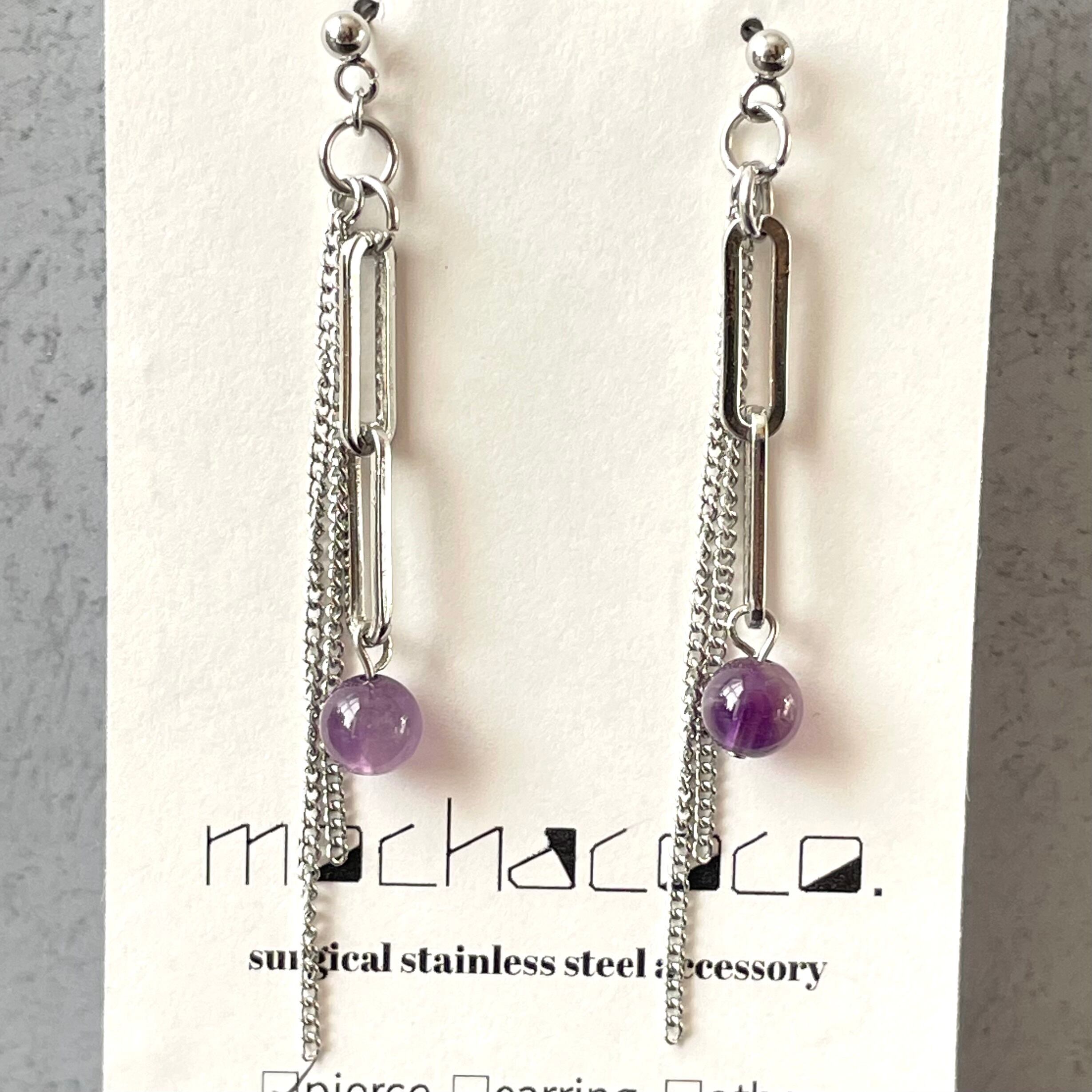天然石ピアス アメジスト チェーンピアス サージカルステンレス シルバー色