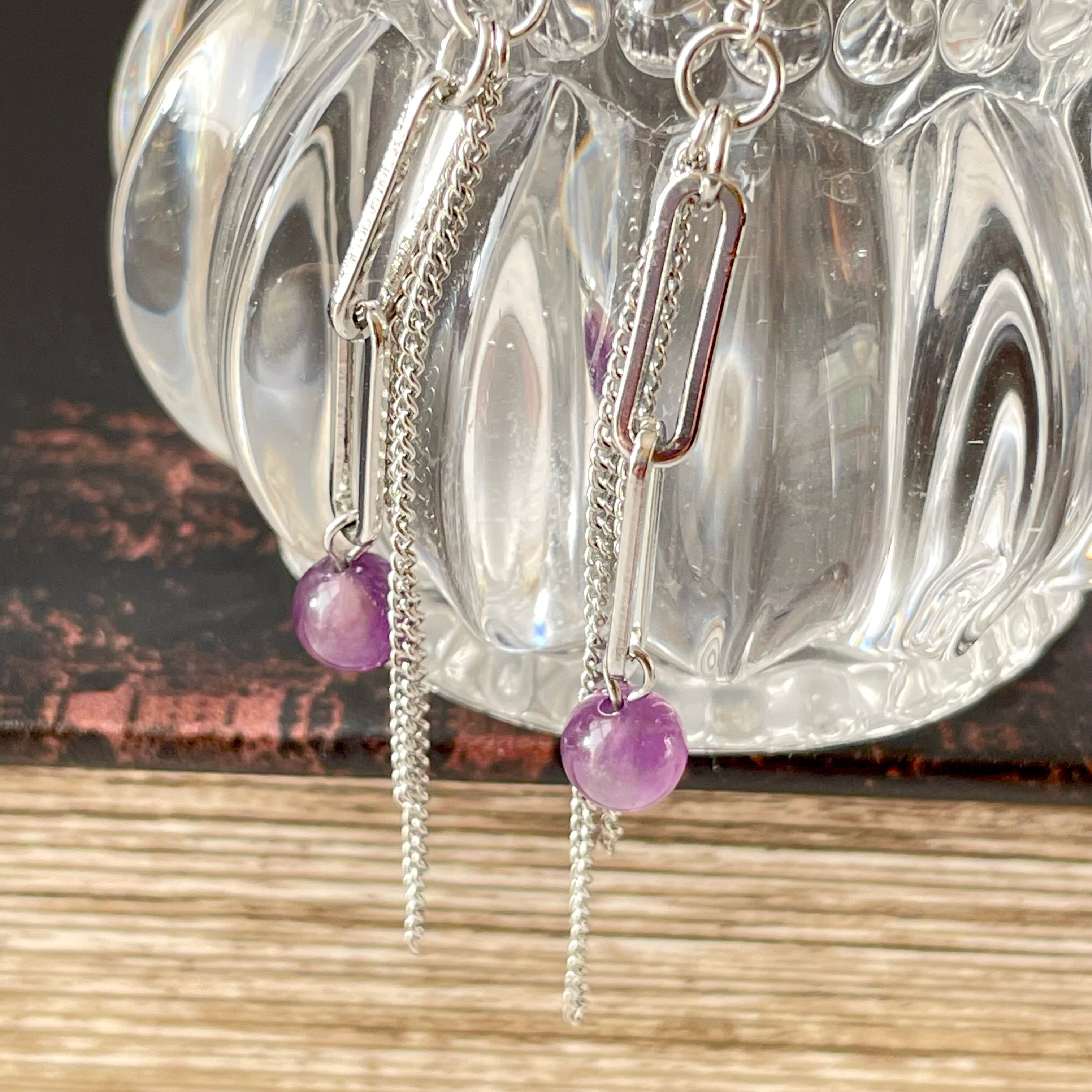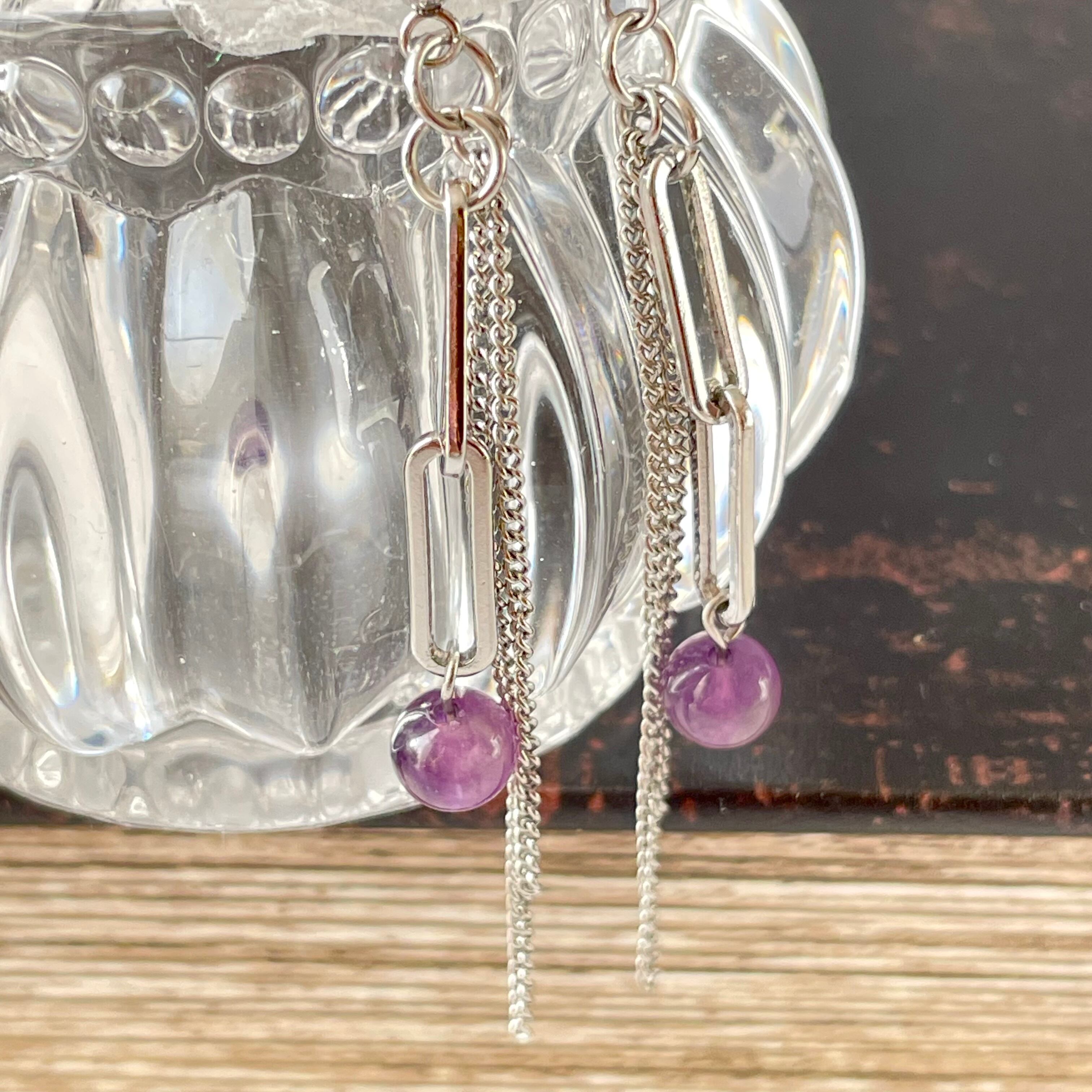 紫色のアメジストが、シルバー色のチェーンと絶妙に調和し、洗練されたデザインを実現。動くたびに耳元で鮮やかな輝きを放ちます。すべてのおしゃれを楽しむ方におすすめです。