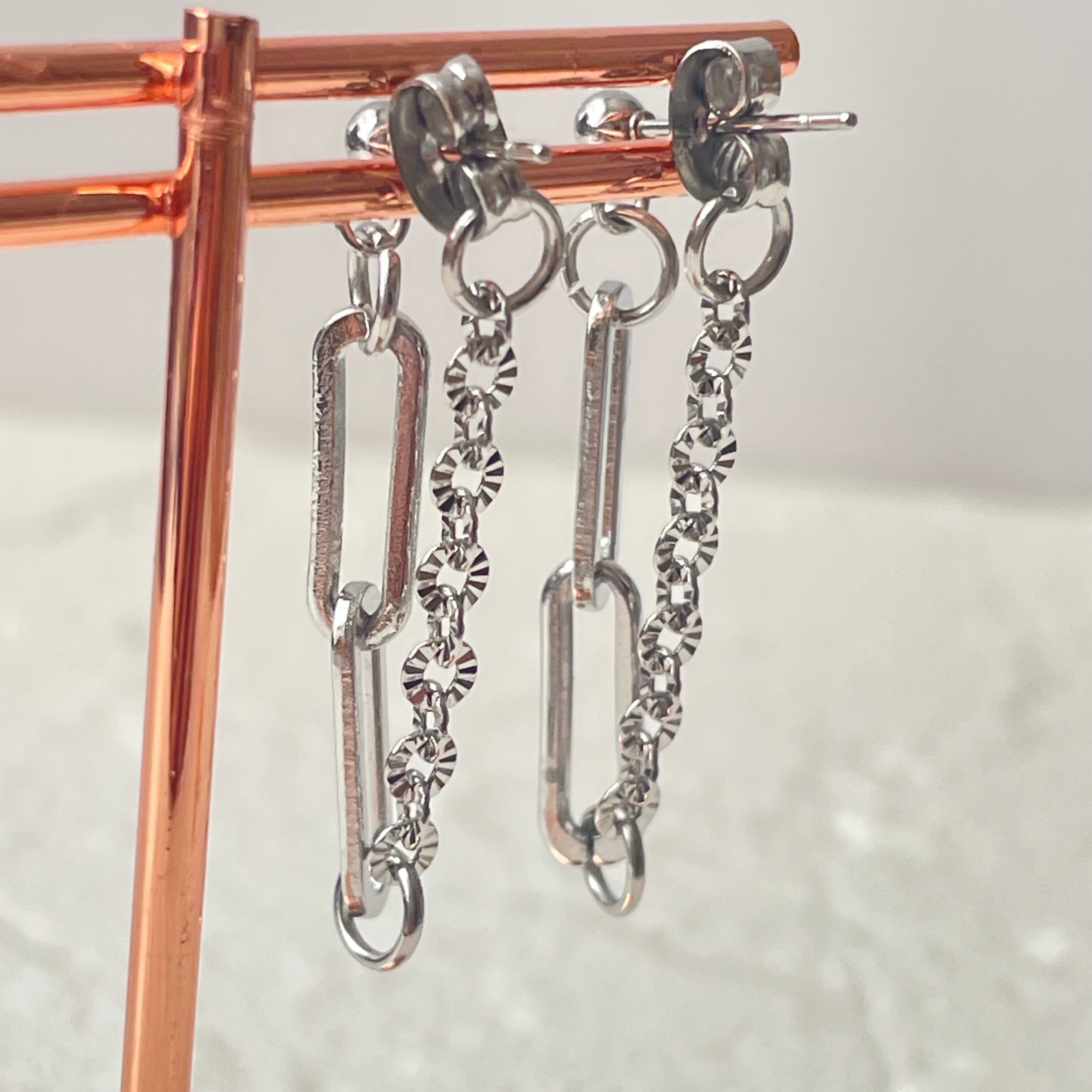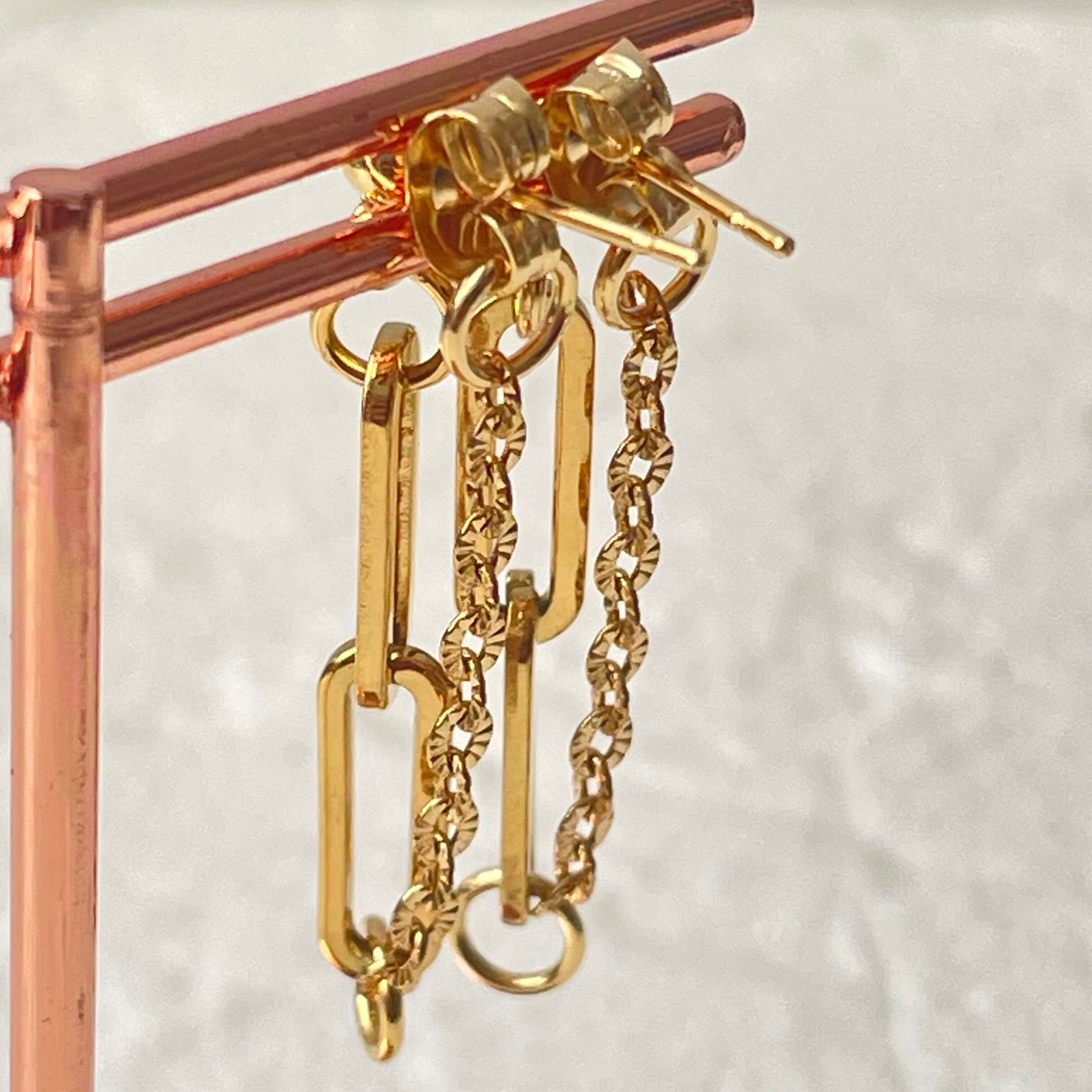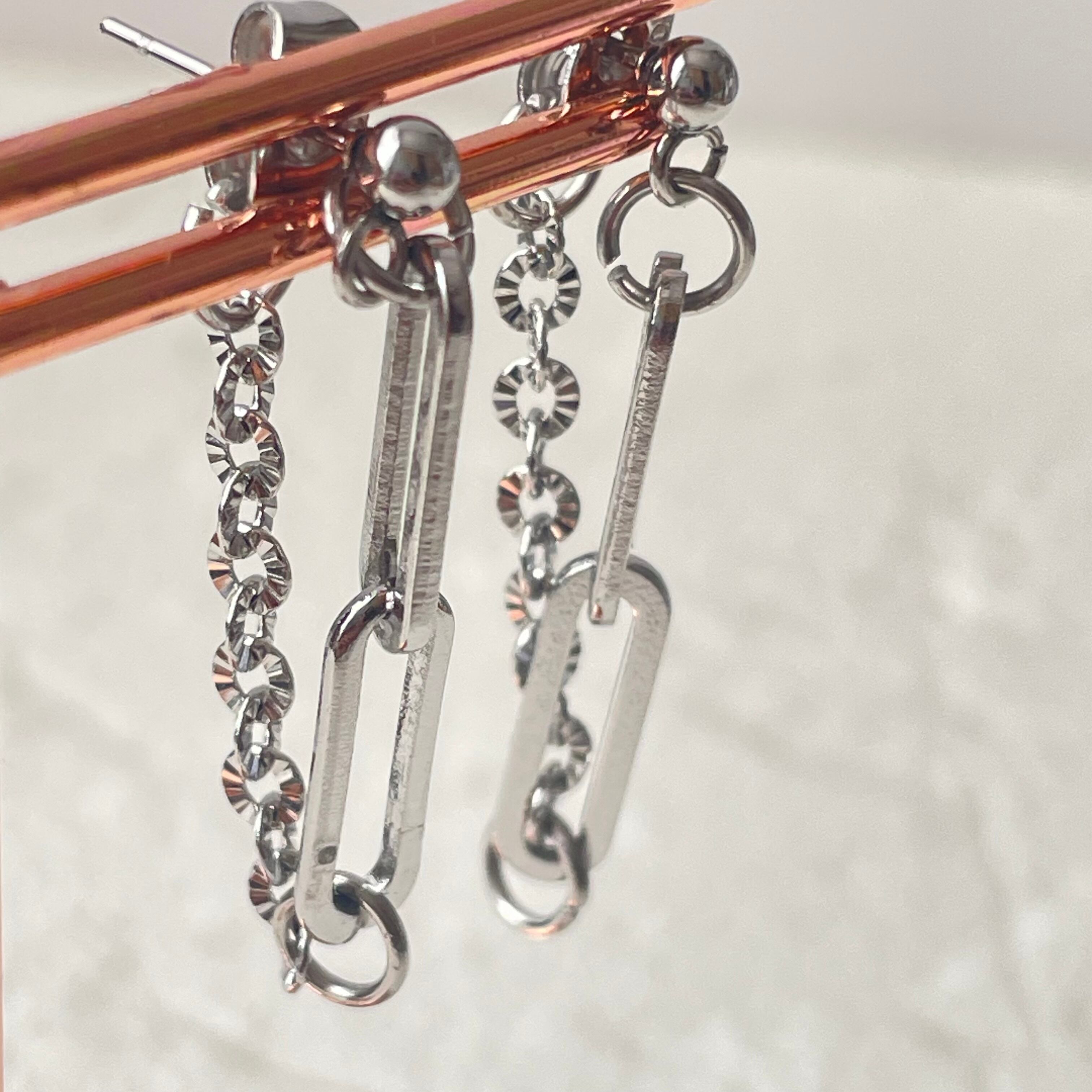 ・2種類のチェーンが織りなす独自のデザインが魅力で、後ろまで美しさが留まる仕上がりです。動くたびに耳元で華やかな輝きを放ち、おしゃれを楽しむ方におすすめです。