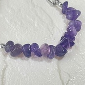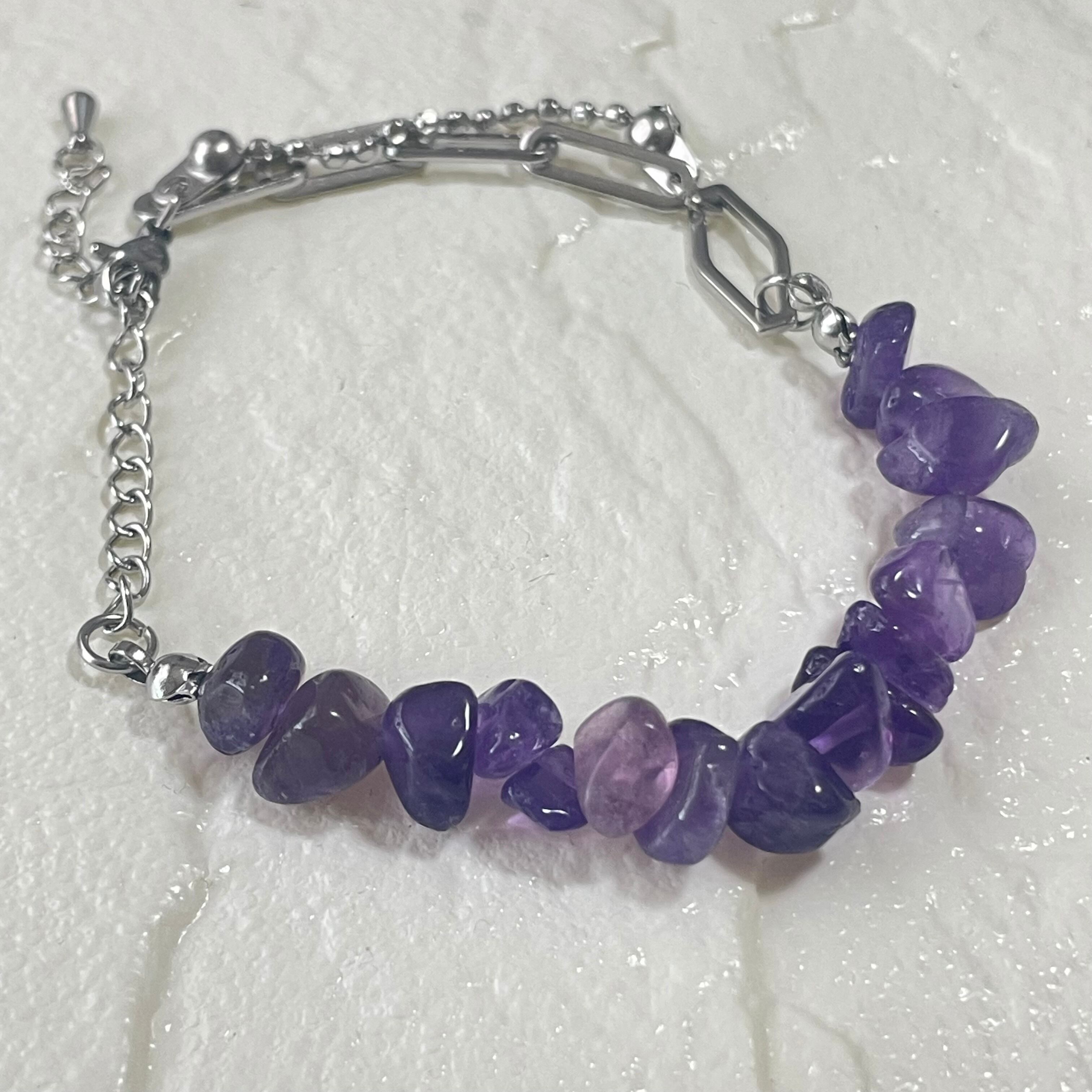 ・小さなアメジストが優雅に光を反射し、シンプルながらも個性的なデザインで、手元を華やかに彩ります。手首の動きに合わせて輝き、魅力を引き立てます。